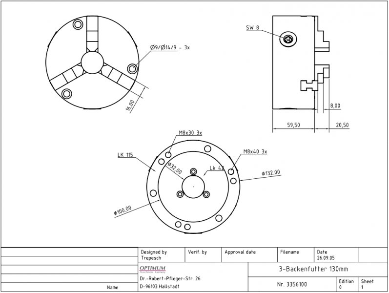 3-čelisťové sklíčidlo 125 mm pro RT 150