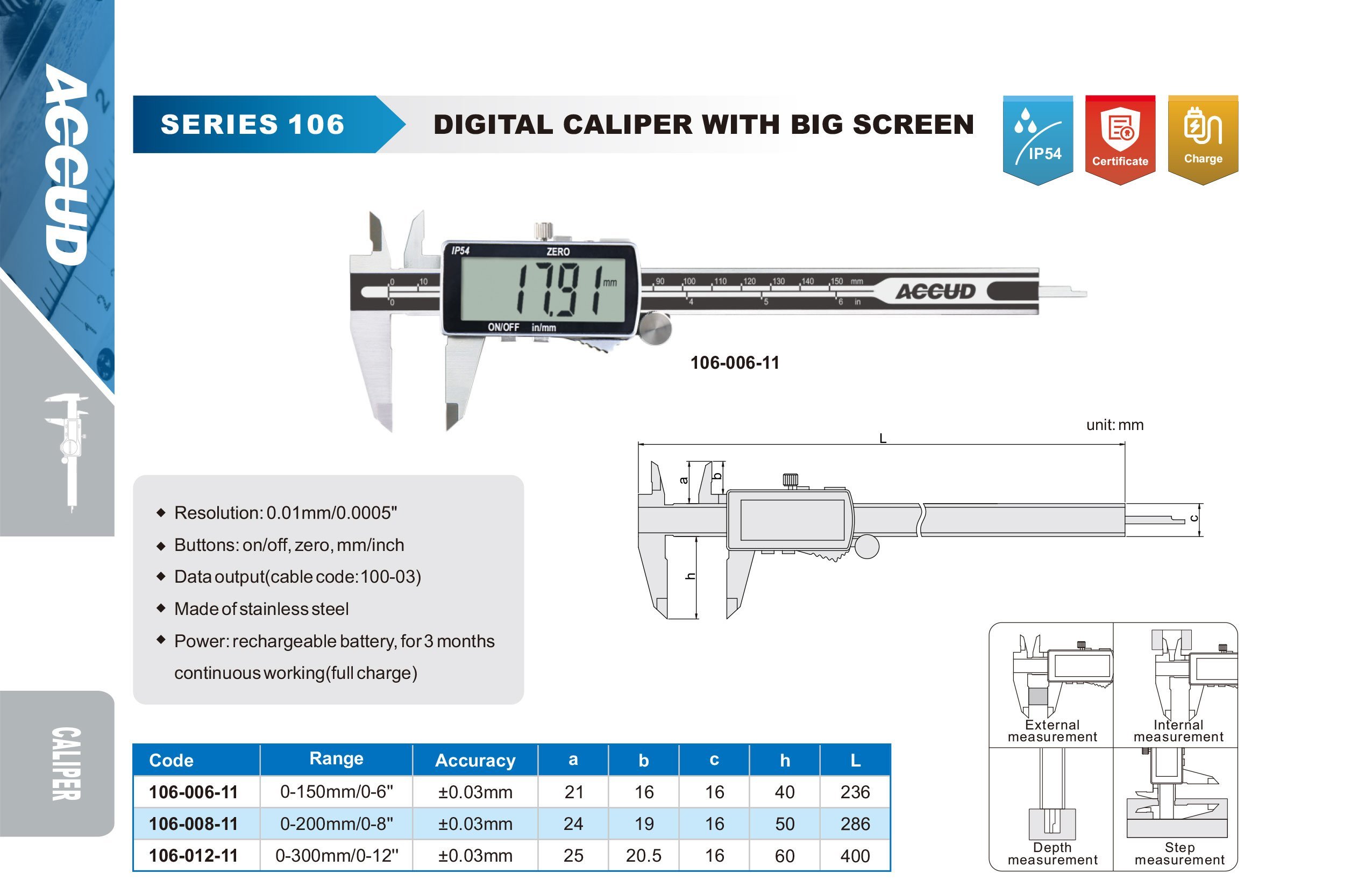 ACCUD 106-008-11 digitální posuvné měřítko 200mm/8" s velkým displejem a krytím IP54 ( 0.01mm/0.0005" )