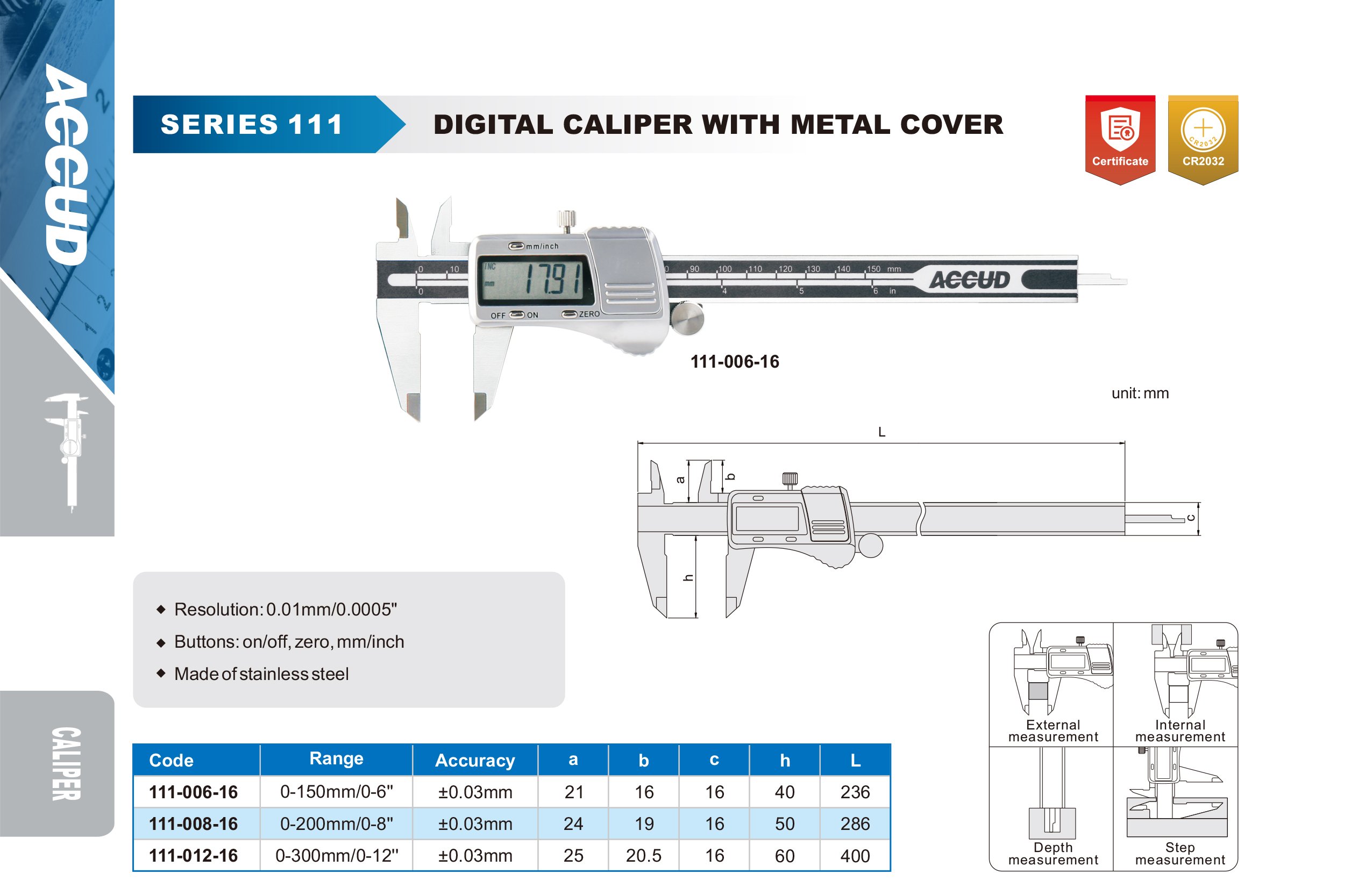 ACCUD 111-008-16 digitální posuvné měřítko 200mm/8" s kovovým jezdcem ( 0.01mm/0.0005" )