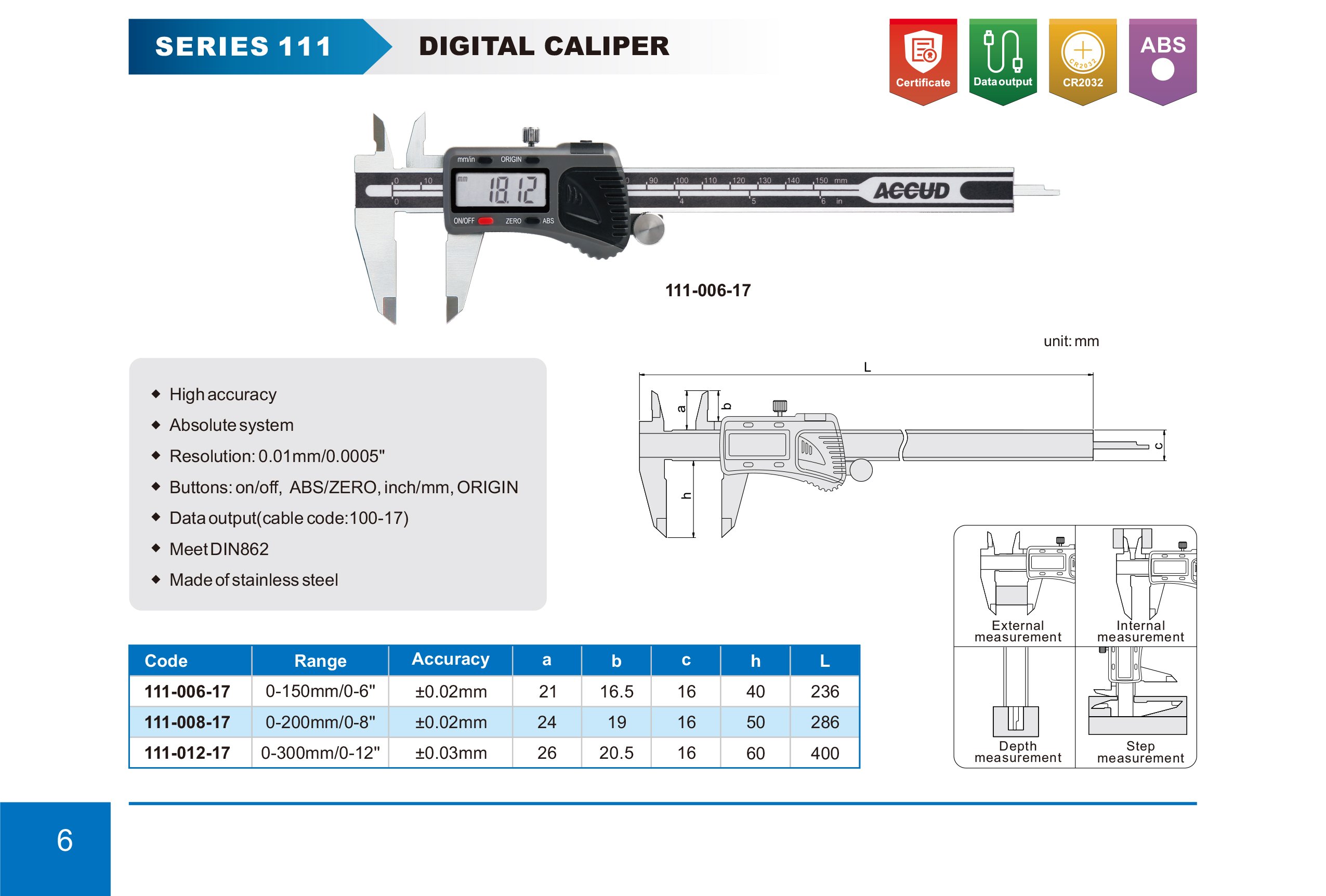 ACCUD 111-008-17 digitální posuvné měřítko 200mm/8" ABS + datový výstup ( 0.01mm/0.0005" )