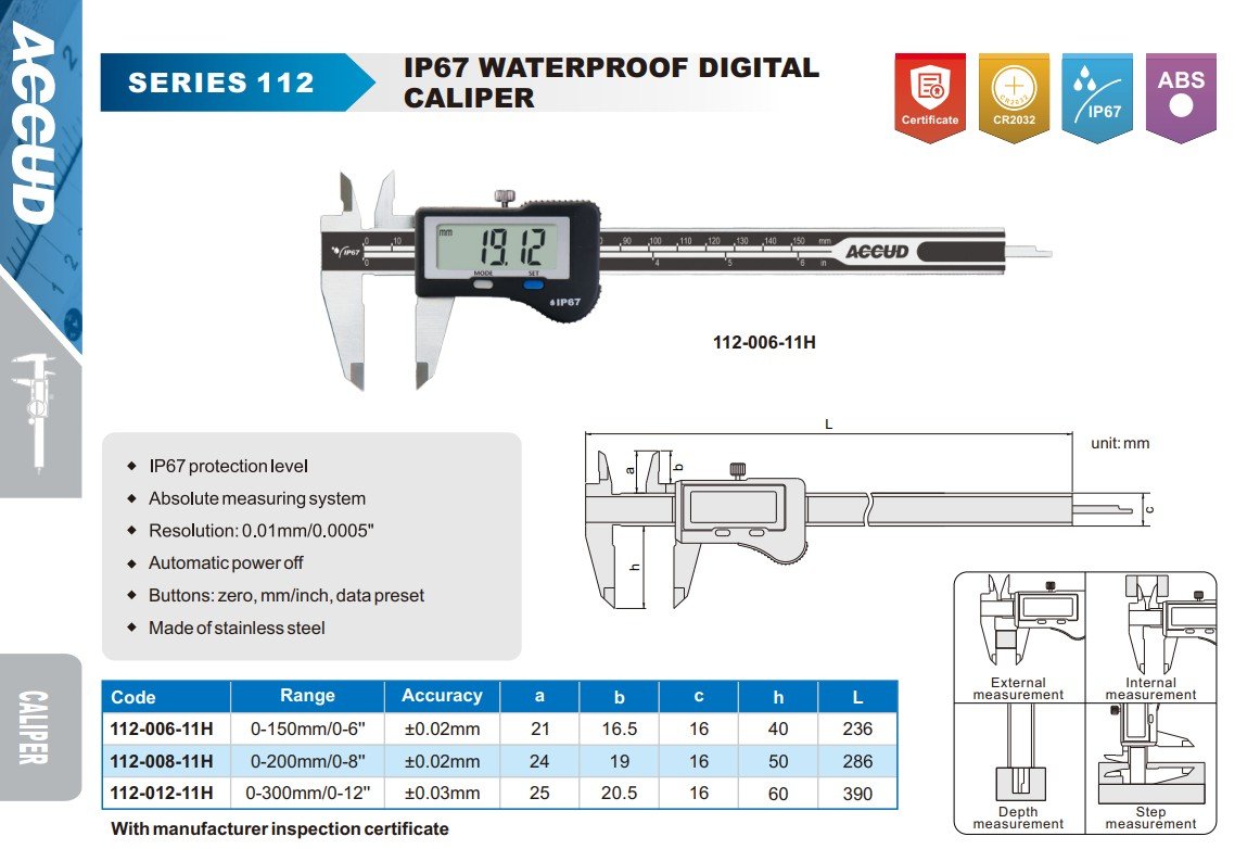 ACCUD 112-006-11H digitální posuvné měřítko 150mm/6" voděodolné IP67 s elektronikou SYLVAC + ABS ( 0.01mm/0.0005" )