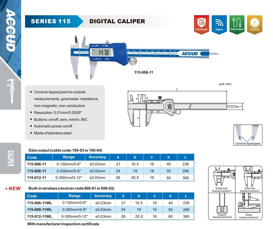 ACCUD 115-008-11 digitální posuvné měřítko 200mm/8" s keramickými čelistmi ( 0.01mm/0.0005" ), výstup dat přes kabel