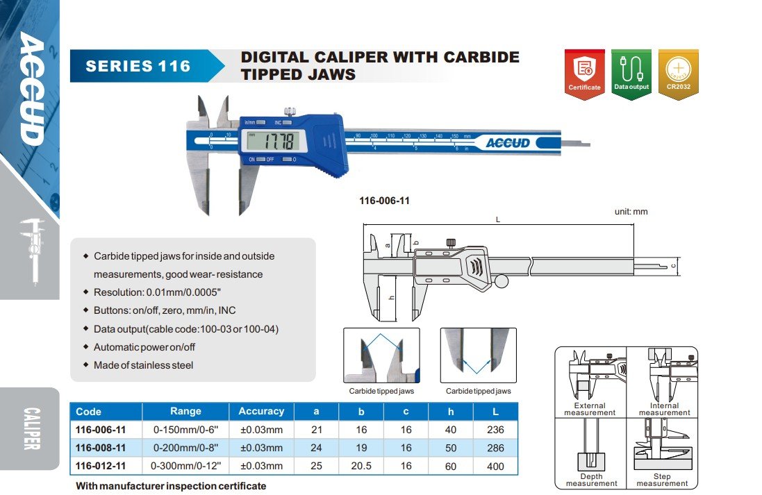 ACCUD 116-012-11 digitální posuvné měřítko 300mm/12" s tvrdokovovými čelistmi (0.01mm/0.0005" )