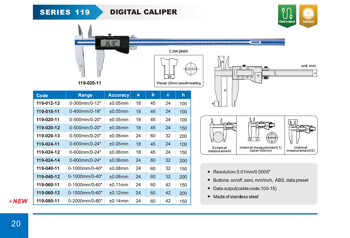 ACCUD 119-018-11 digitální posuvné měřítko 450mm/18" ( délka měřících ramen 100mm ) s horními čelistmi, ABS ( 0.01mm/0.0005" )
