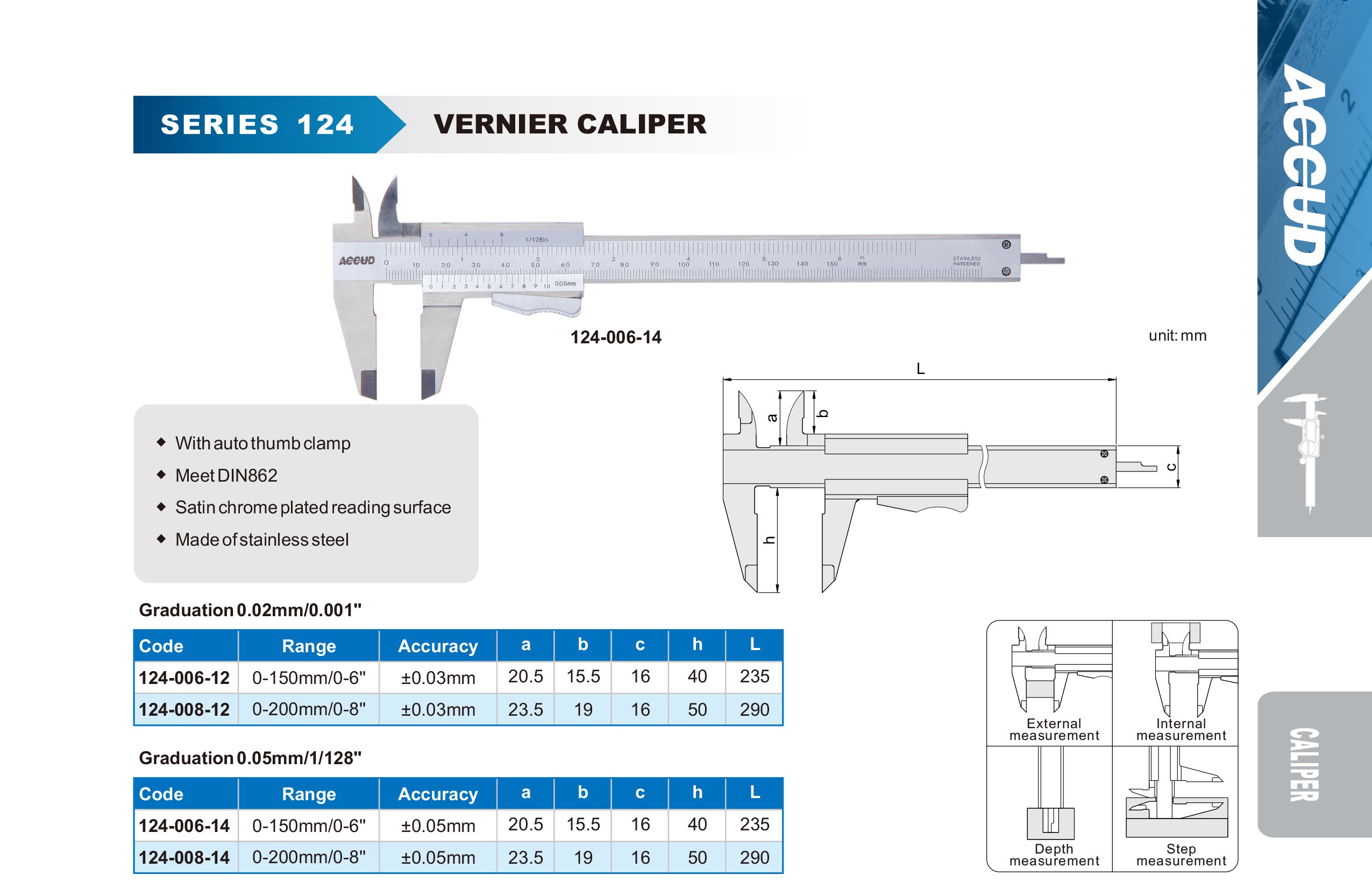 ACCUD 124-008-14 analogové posuvné měřítko s automatickou pojistkou 200mm/8” ( 0.05mm/1/128" )