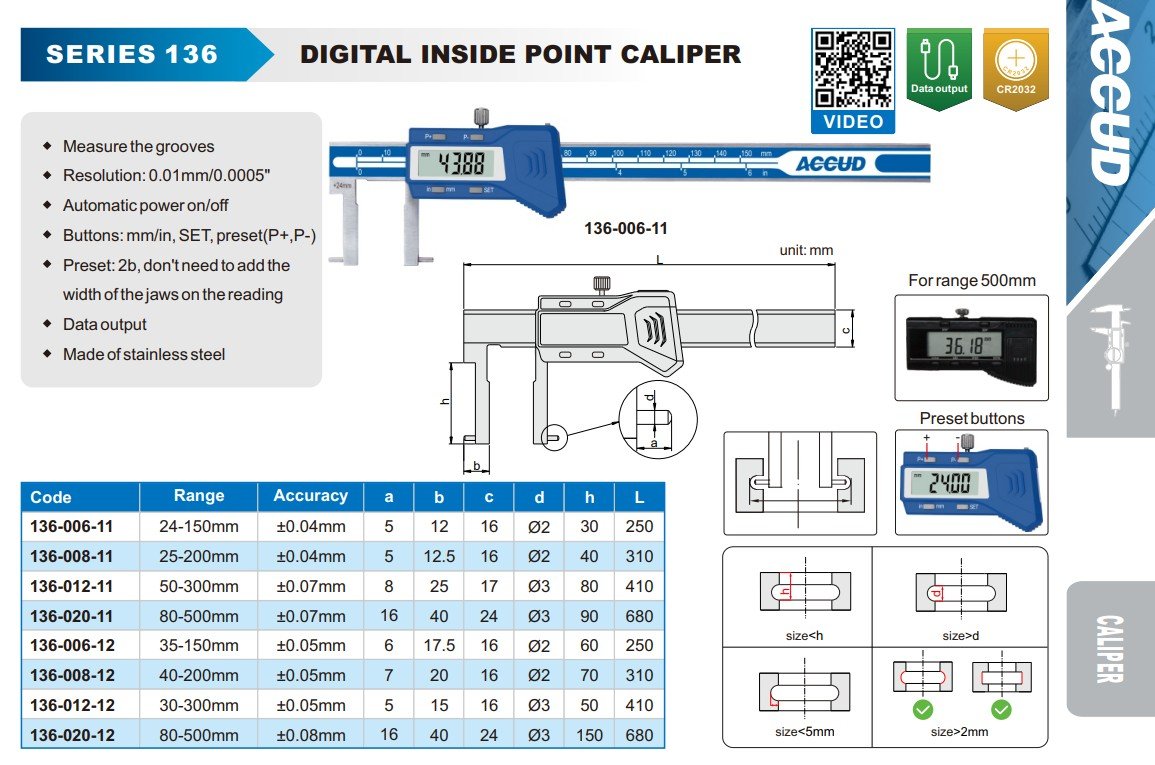 ACCUD 136-012-11 digitální posuvné měřítko pro vnitřní drážky 50-300mm ( 0.01mm/0.0005" )