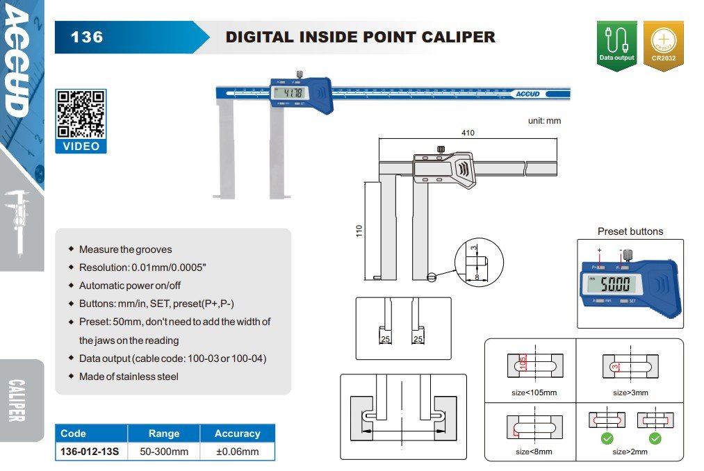 ACCUD 136-012-13S digitální posuvné měřítko pro vnitřní drážky 50-300mm délka měřících ramen 110mmm ( 0.01mm/0.0005" )