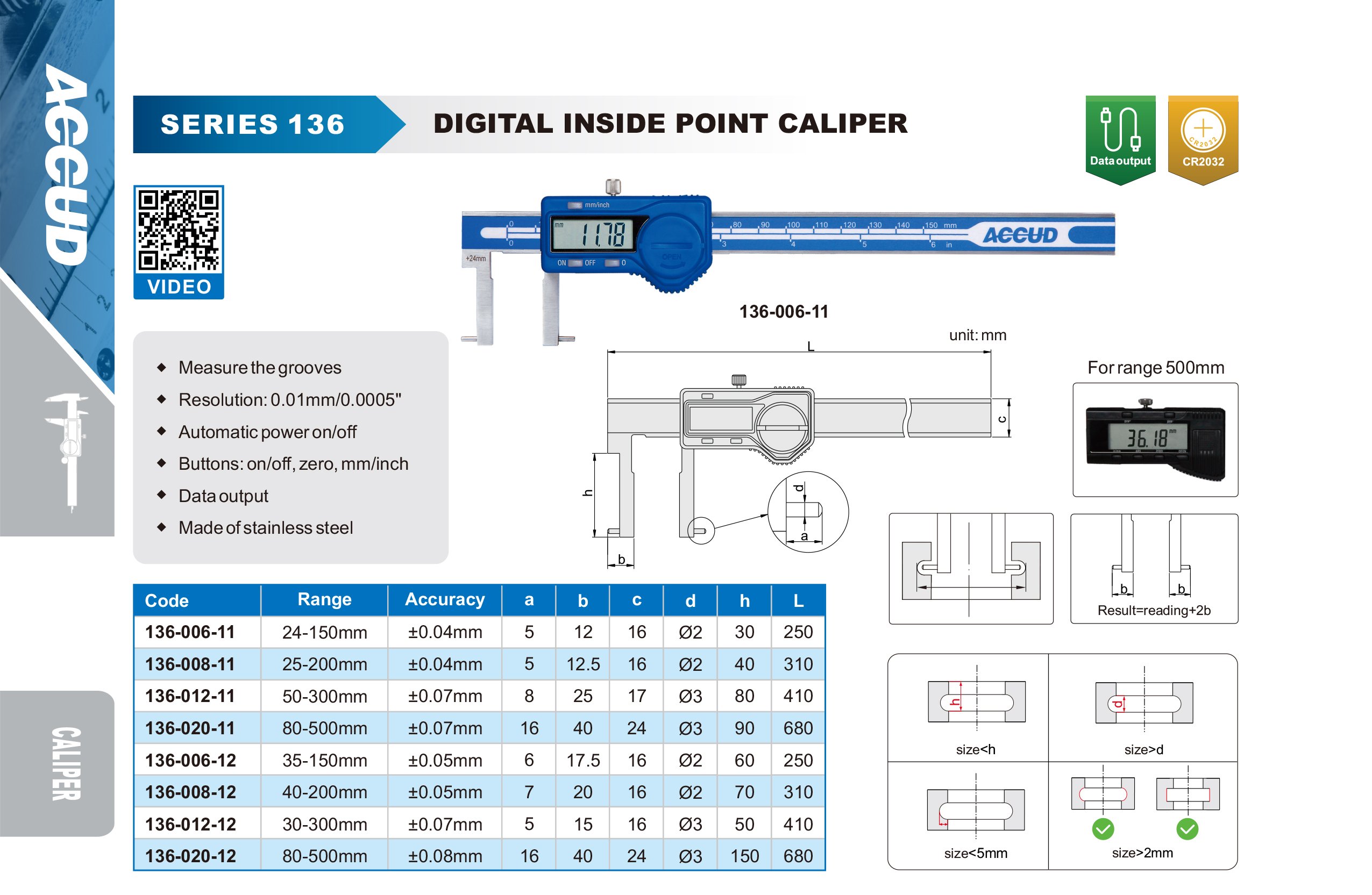 ACCUD 136-020-11 digitální posuvné měřítko pro vnitřní drážky 80-500mm ( 0.01mm/0.0005" )