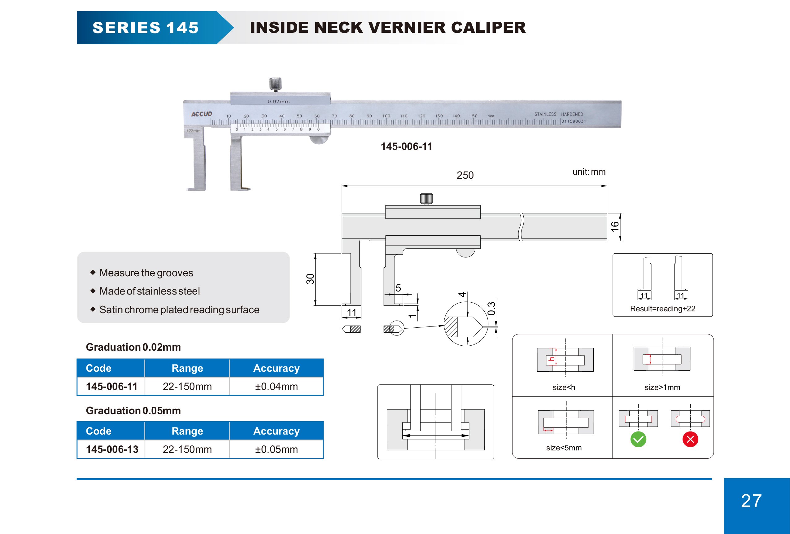 ACCUD 145-006-13 analogové posuvné měřítko pro vnitřní drážky 22-150mm ( 0.05mm )