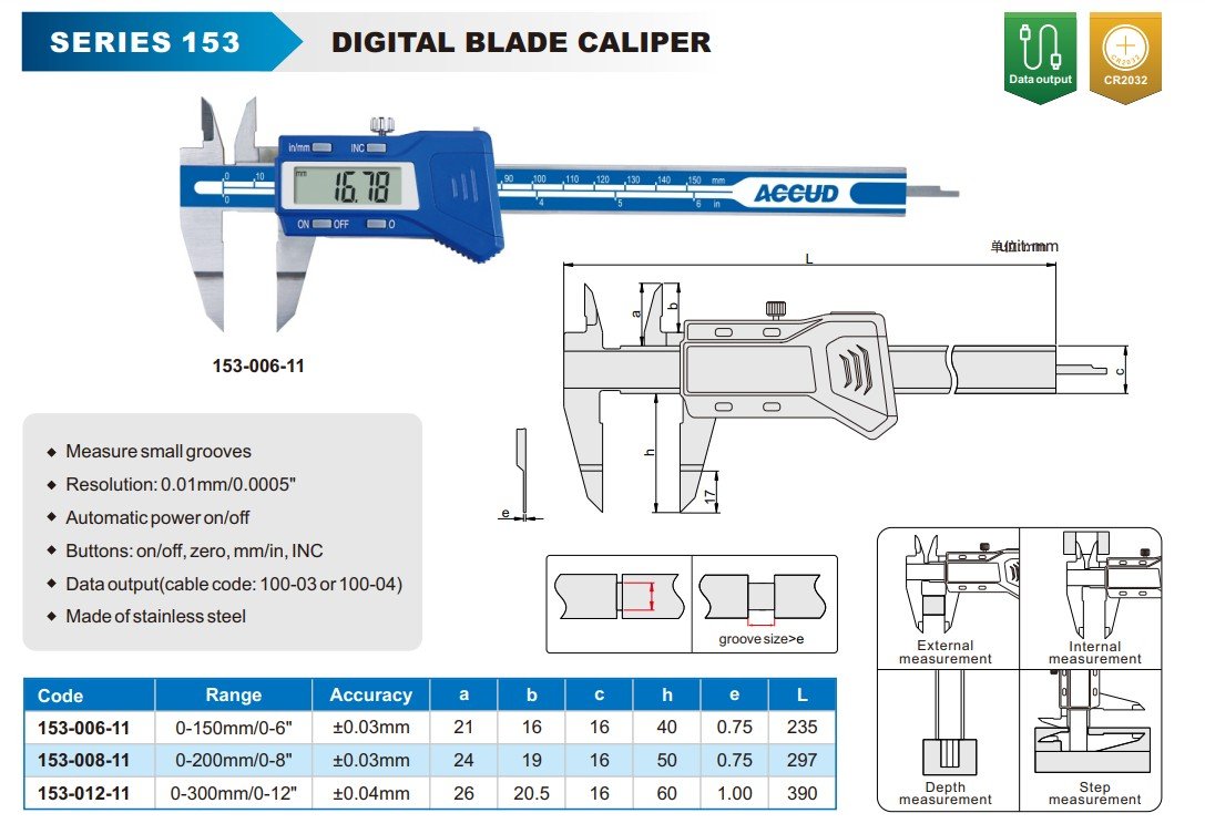 ACCUD 153-012-11 digitální posuvné měřítko se zůženými spodními rameny 0-300mm/0-12" ( 0.01mm/0.0005" )