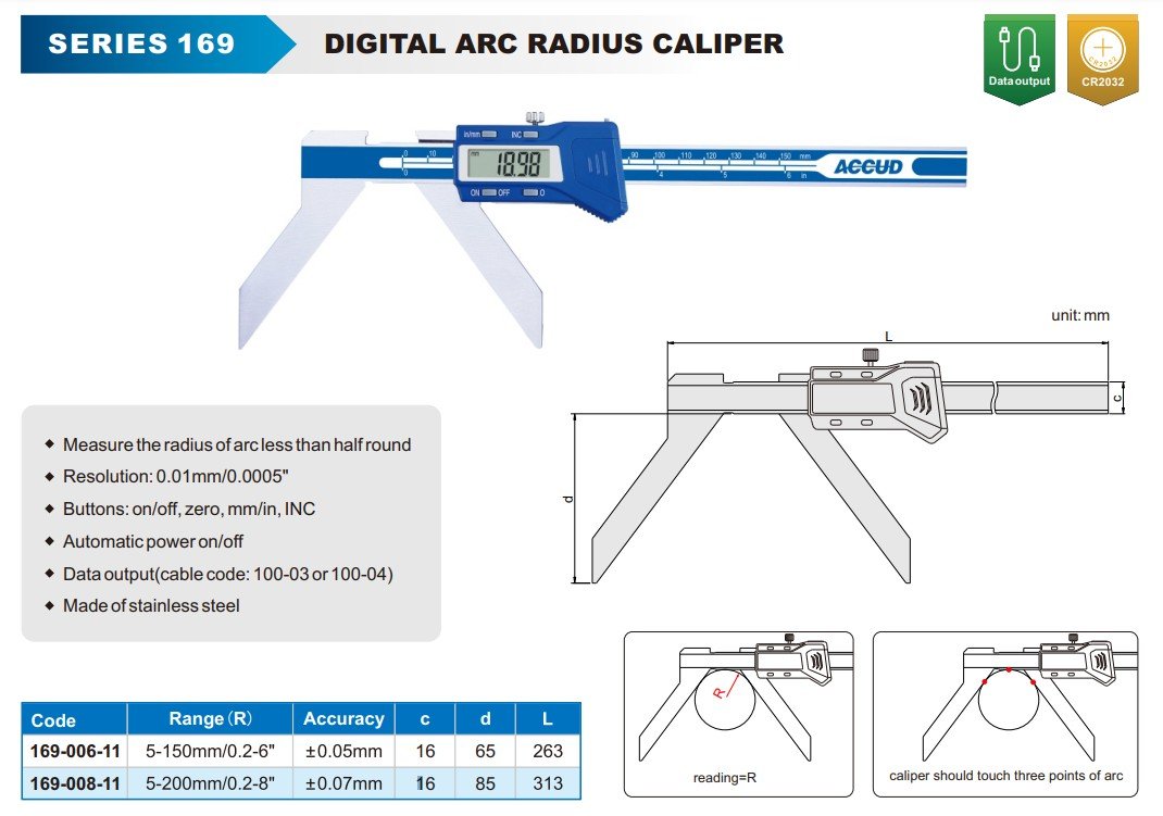 ACCUD 169-006-11 digitální posuvné měřítko poloměrové 5-150mm/0.2-6" ( 0.01mm/0.0005" )