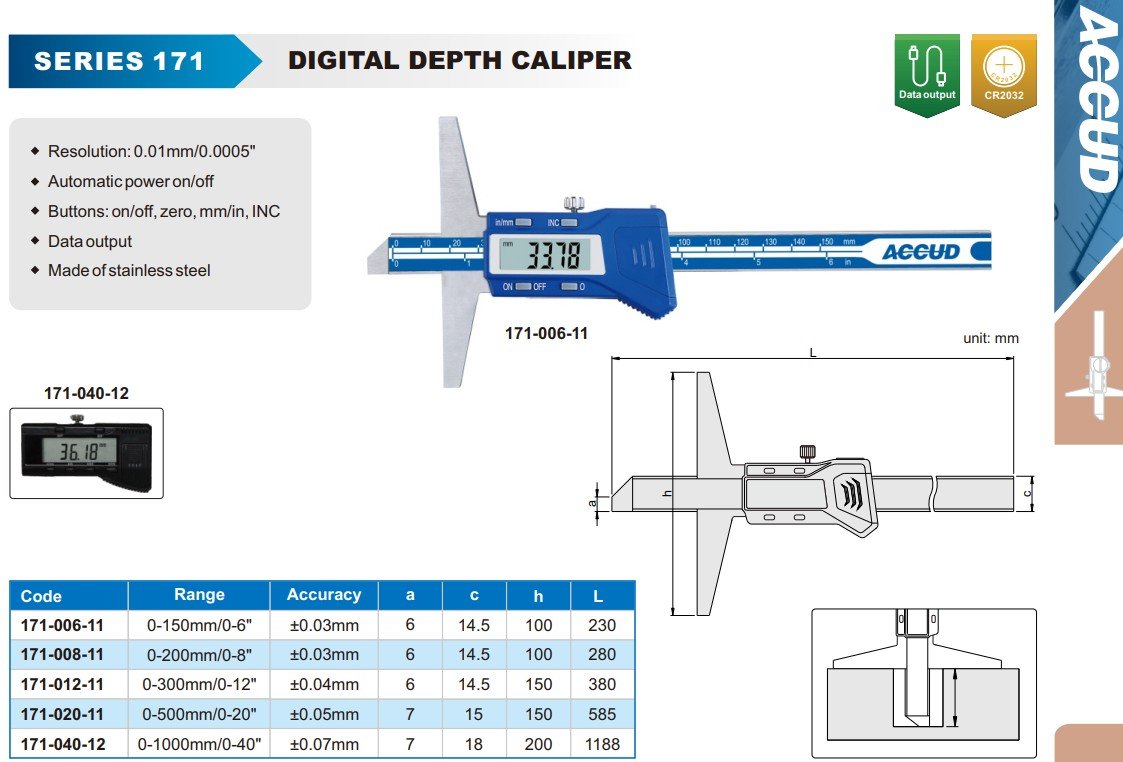 ACCUD 171-040-12 digitální hloubkoměr 1000mm/40" ( 0.01mm/0.0005" )