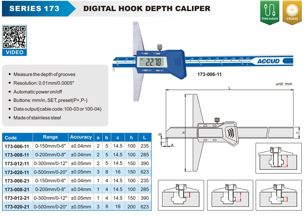 ACCUD 173-020-11 digitální hloubkoměr s 3mm nosem 500mm/20", rozměr základny 150mm ( 0.01mm/0.0005" )