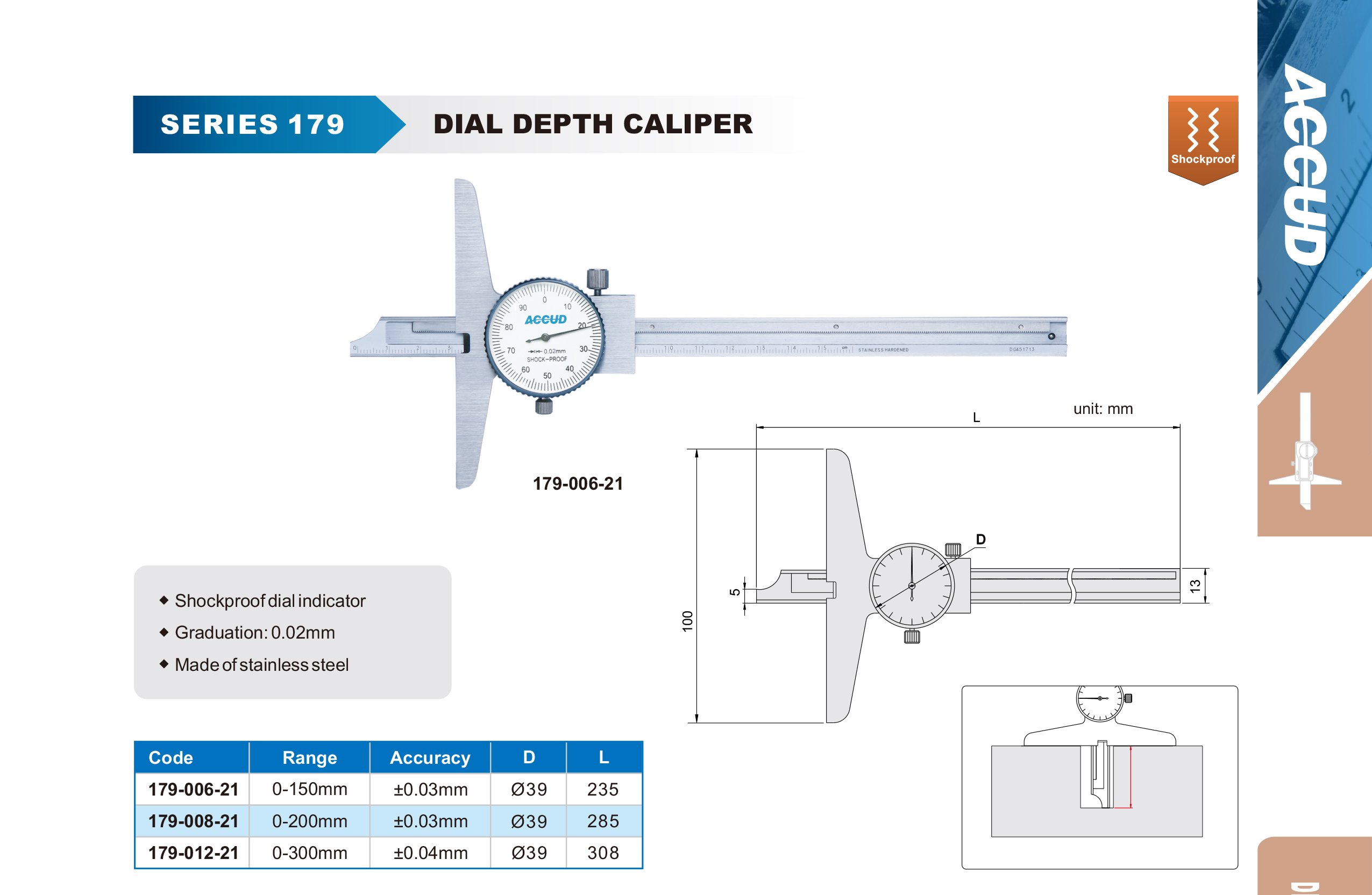 ACCUD 179-012-21 analogový hloubkoměr s číselníkem 300mm / 0.02mm