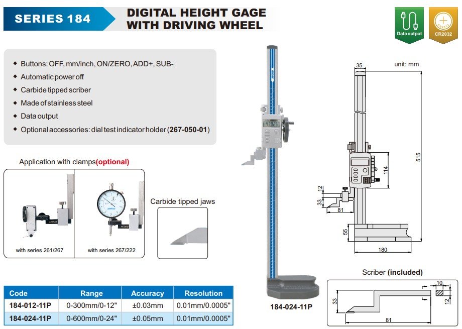 Digitální výškoměr s posuvným kolečkem pro přesné měření, s nerezovým provedením, datovým výstupem a karbidovým rýsovacím hrotem. Možnost rozšíření o příslušenství.