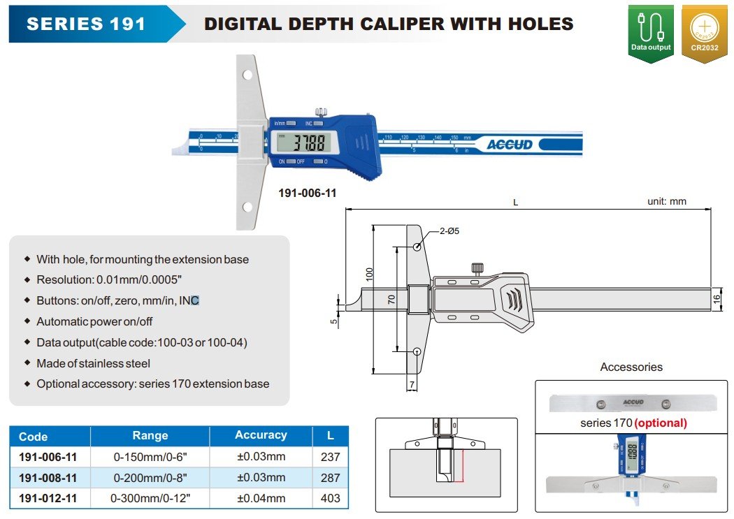 ACCUD 191-008-11 digitální hloubkoměr s otvory 200mm/8" ( 0.01mm/0.0005" )