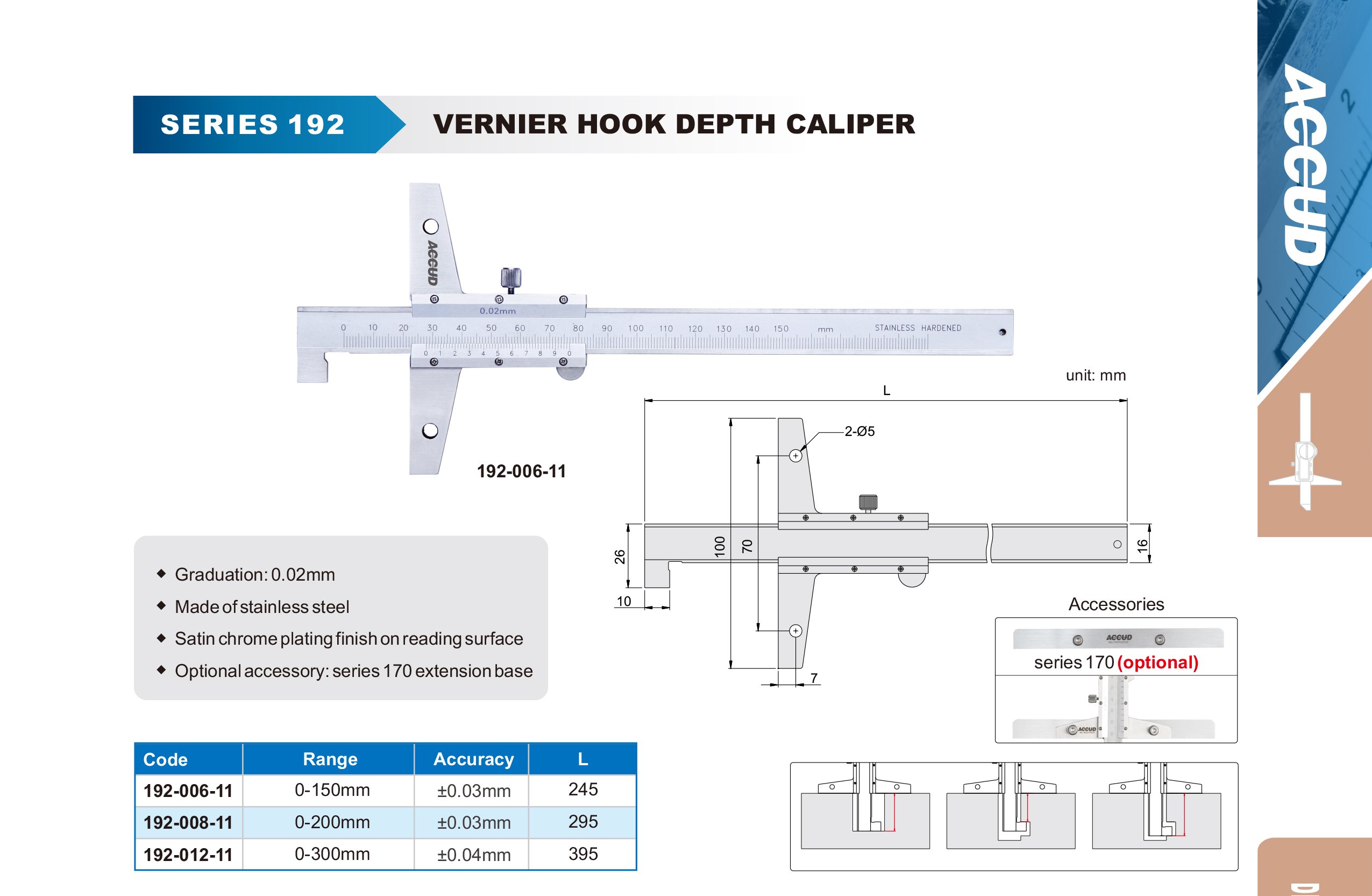 ACCUD 192-012-11 analogový hloubkoměr s nosem 300mm / 0.02mm
