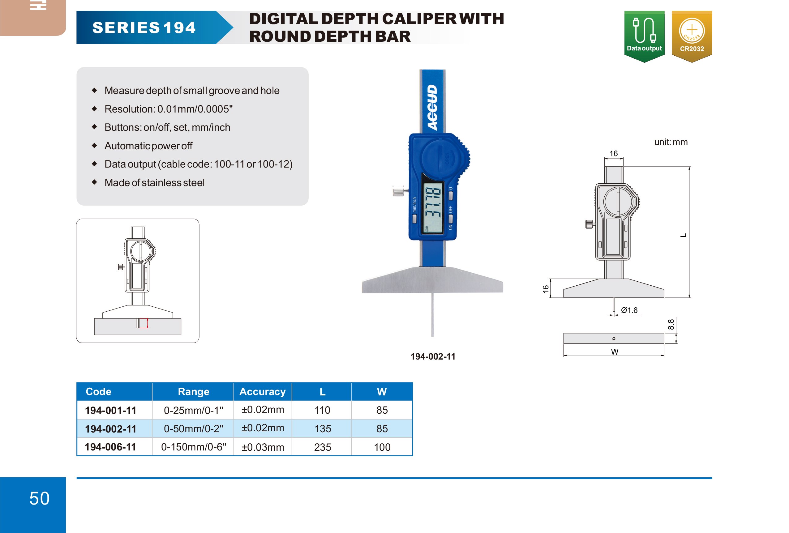 ACCUD 194-002-11 MINI digitální hloubkoměr s oválnou měřící hřídelí 50mm/2" ( 0.01mm/0.0005" )