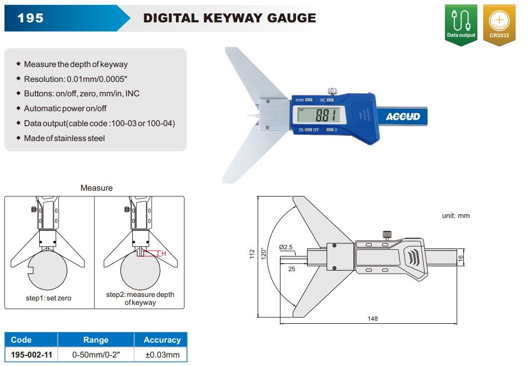 ACCUD 195-002-11 digitální hloubkoměr pro měření drážky pera na hřídeli 0-50mm 0-2" ( 0.01mm/0.0005" )