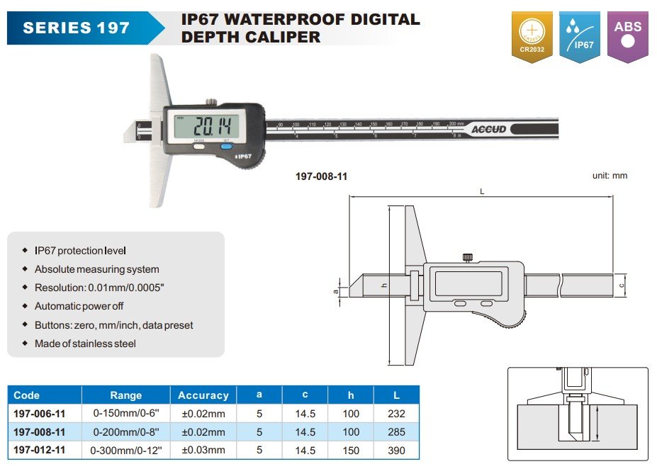 ACCUD 197-008-11 IP67 voděodolný digitální hloubkoměr 200mm/8" elektronika SYLVAC ( 0.01mm/0.0005" )