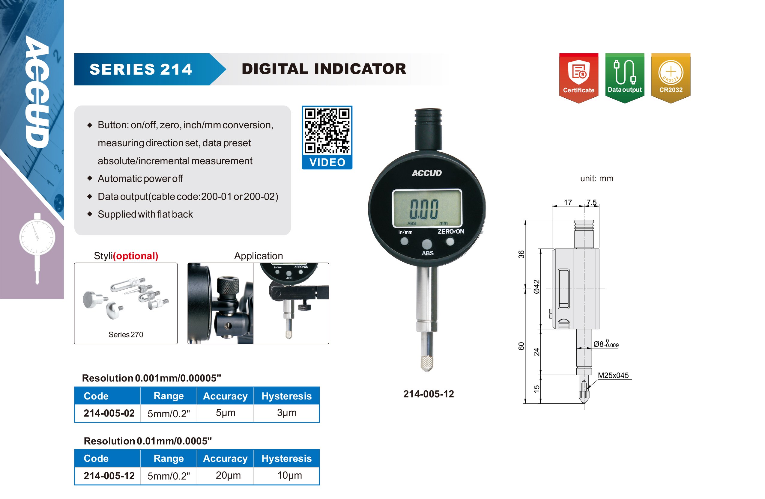 ACCUD 214-005-02 digitální úchylkoměr, s plochou zadní stranou / 0-5mm / 0.001mm