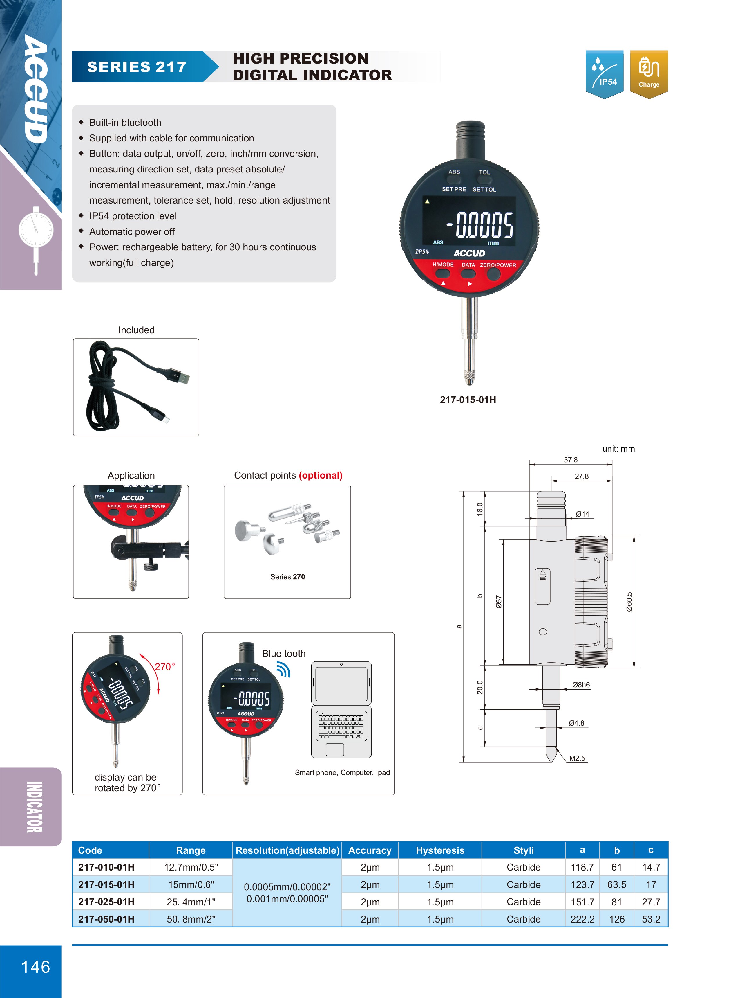 ACCUD 217-050-01H velice přesný digitální úchylkoměr / 0-50.8mm/0-2" / 0.0005mm/0.00002"