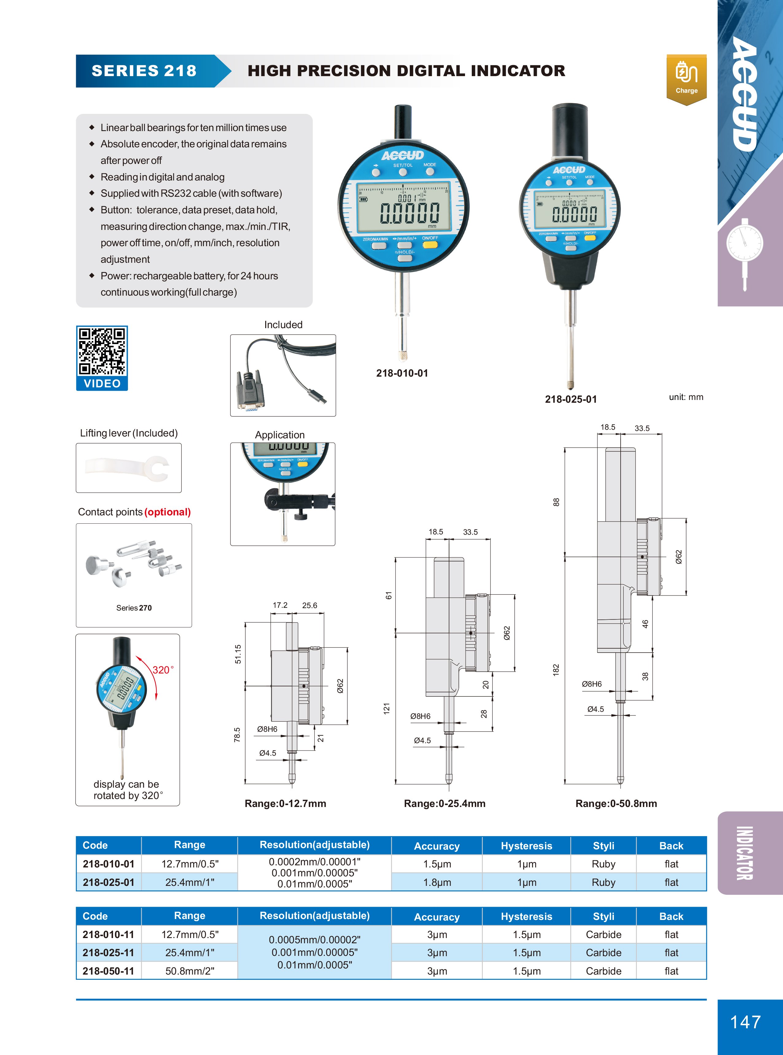 ACCUD 218-050-11 velice přesný digitální úchylkoměr, s plochou zadní stranou / 50.8mm/2" / 0.0005mm/0.00001"
