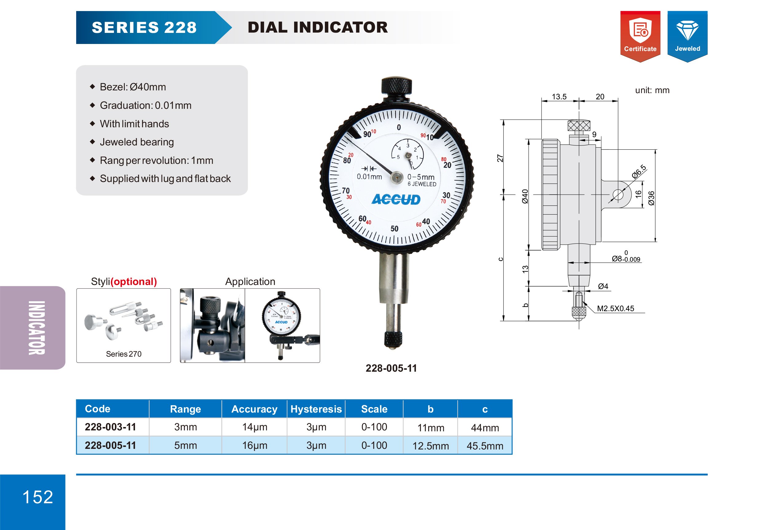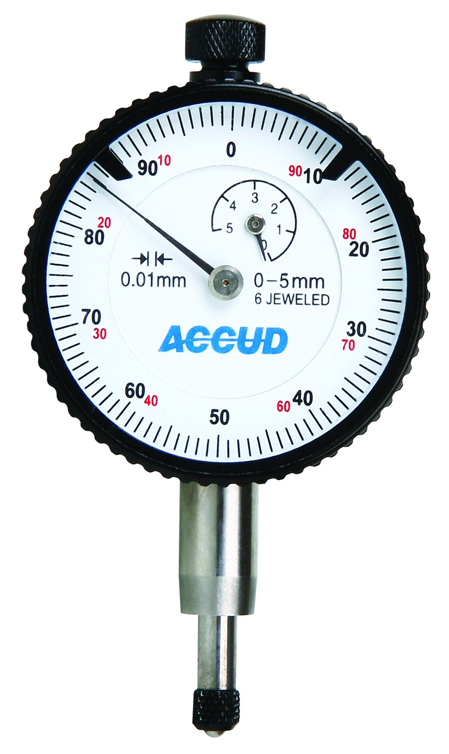 ACCUD 228-005-11 přesný číselníkový úchylkoměr 0-5mm ( 0,01mm ) s ouškem i s plochou zadní stranou / ciferník pr. 40mm