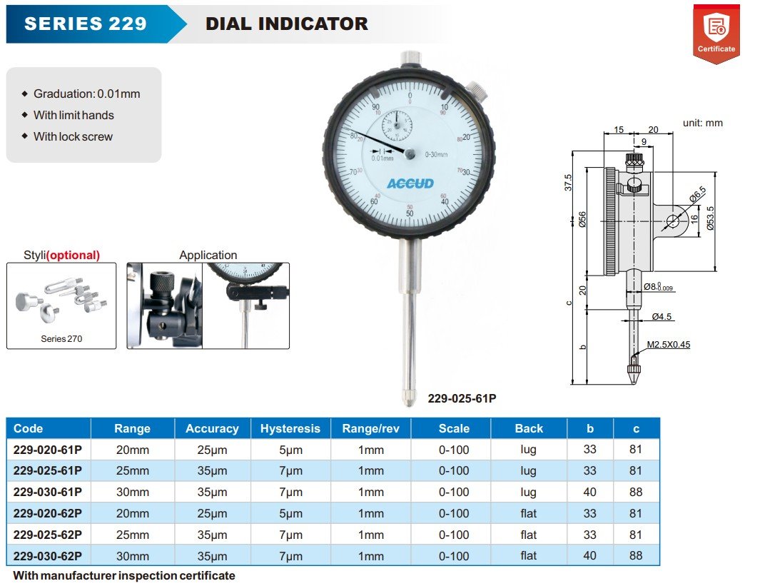 ACCUD 229-025-61P číselníkový úchylkoměr 25mm ( s ouškem )