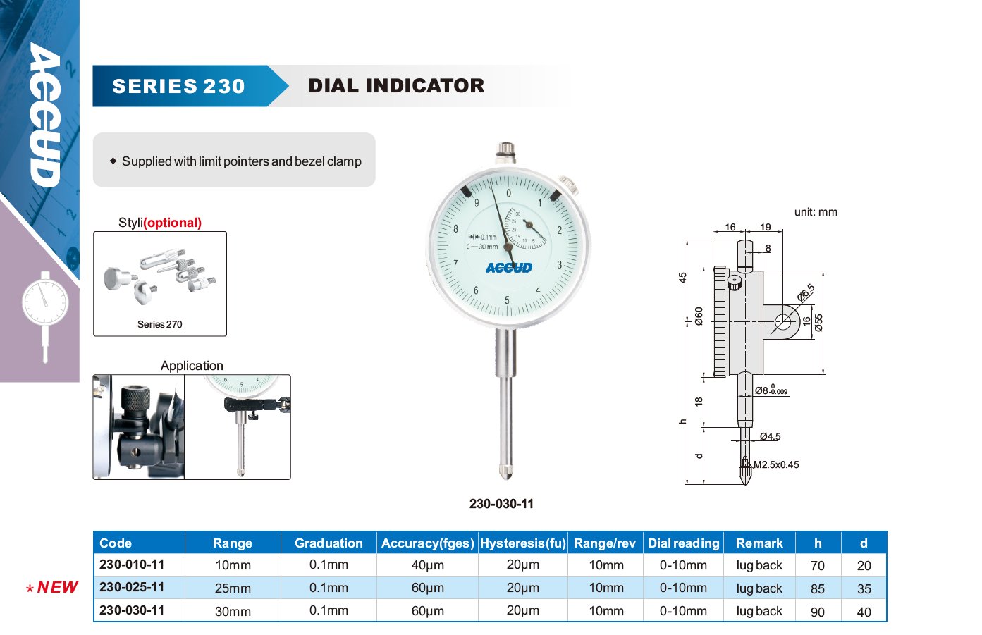 ACCUD 230-010-11 mechanický přesný číselníkový úchylkoměr 0-10mm ( 0,1mm ) s ouškem na zadní straně