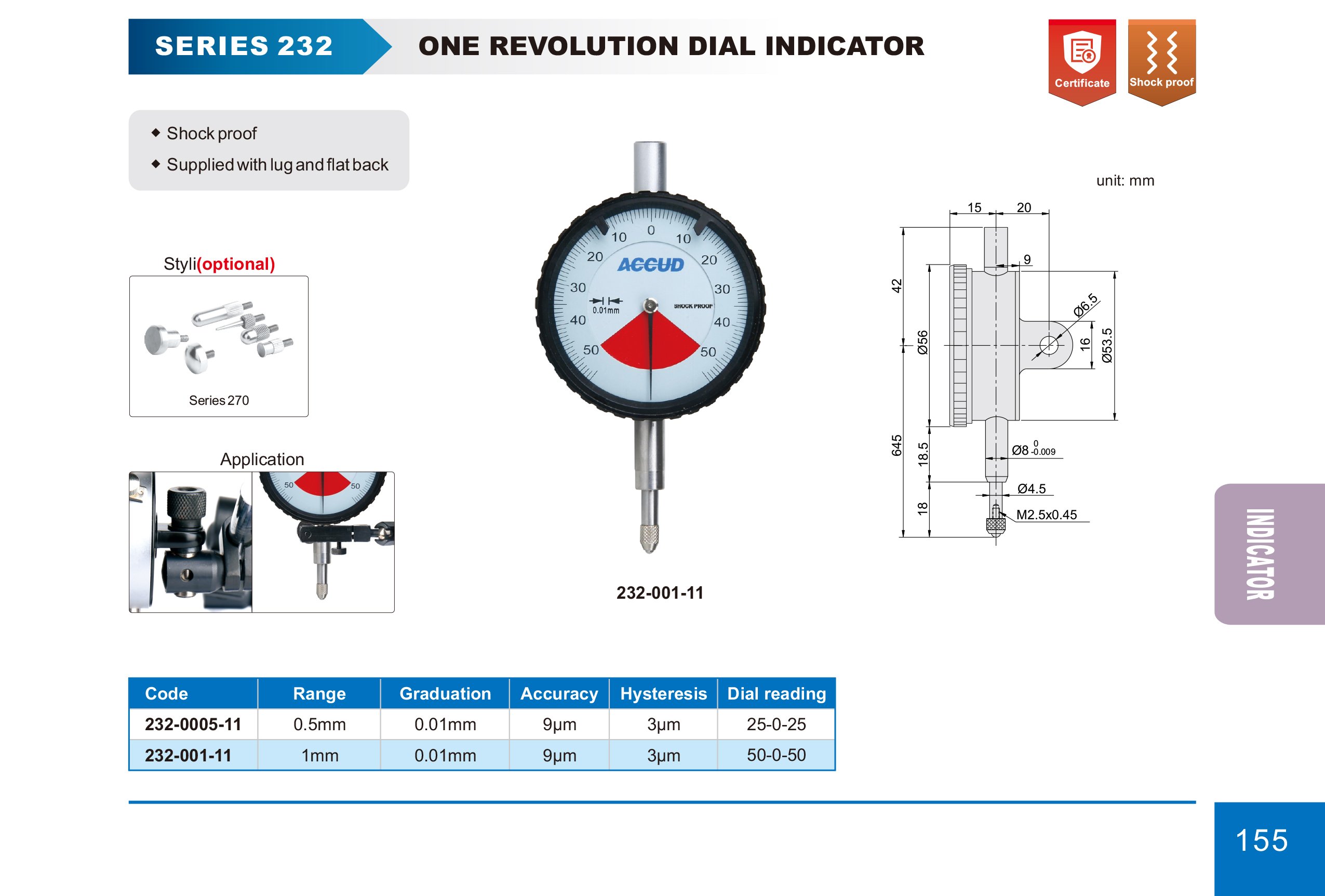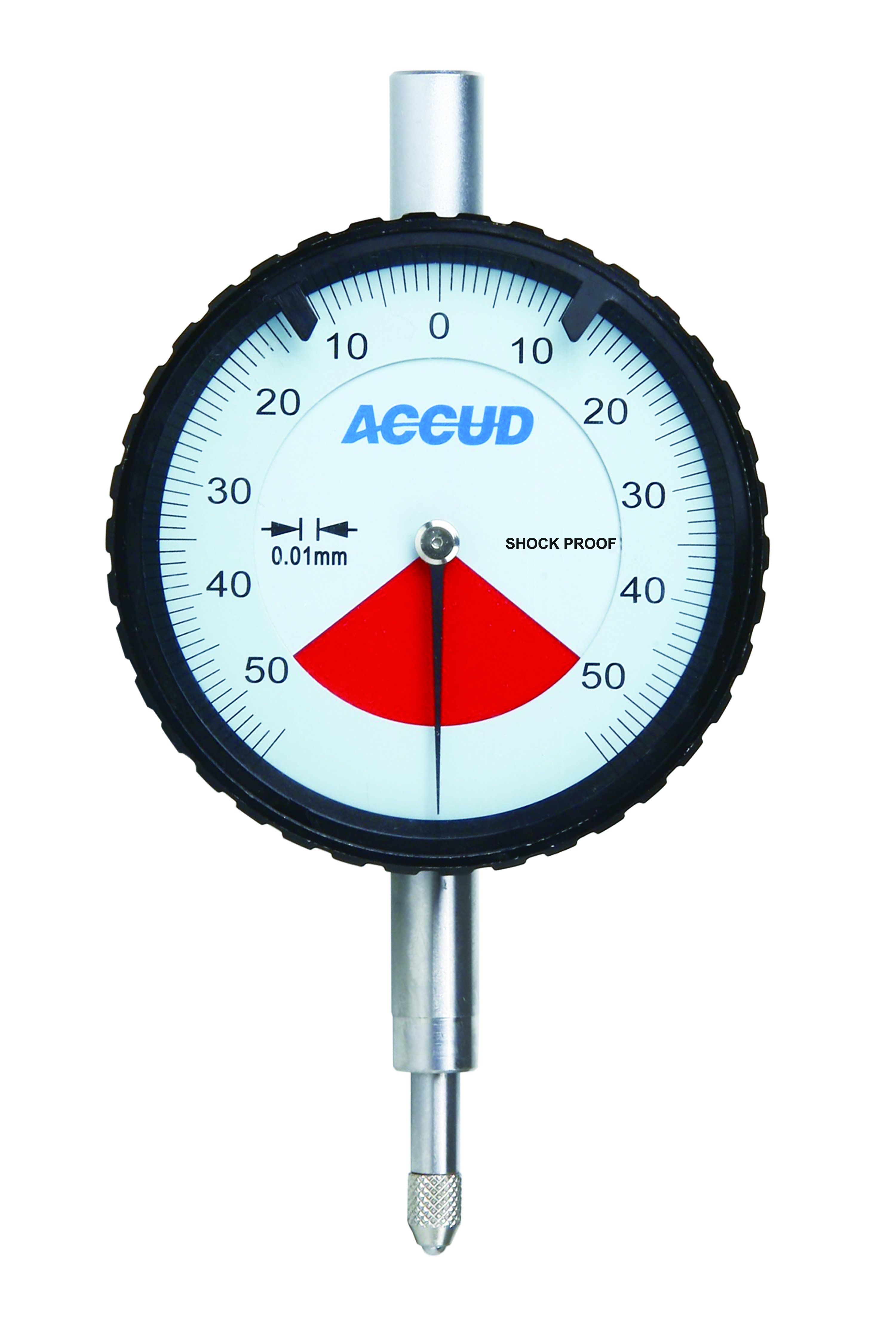 ACCUD 232-001-11 přesný číselníkový úchylkoměr s jednou otáčkou 0-1mm ( 0,01mm ) s ouškem i s plochou zadní stranou