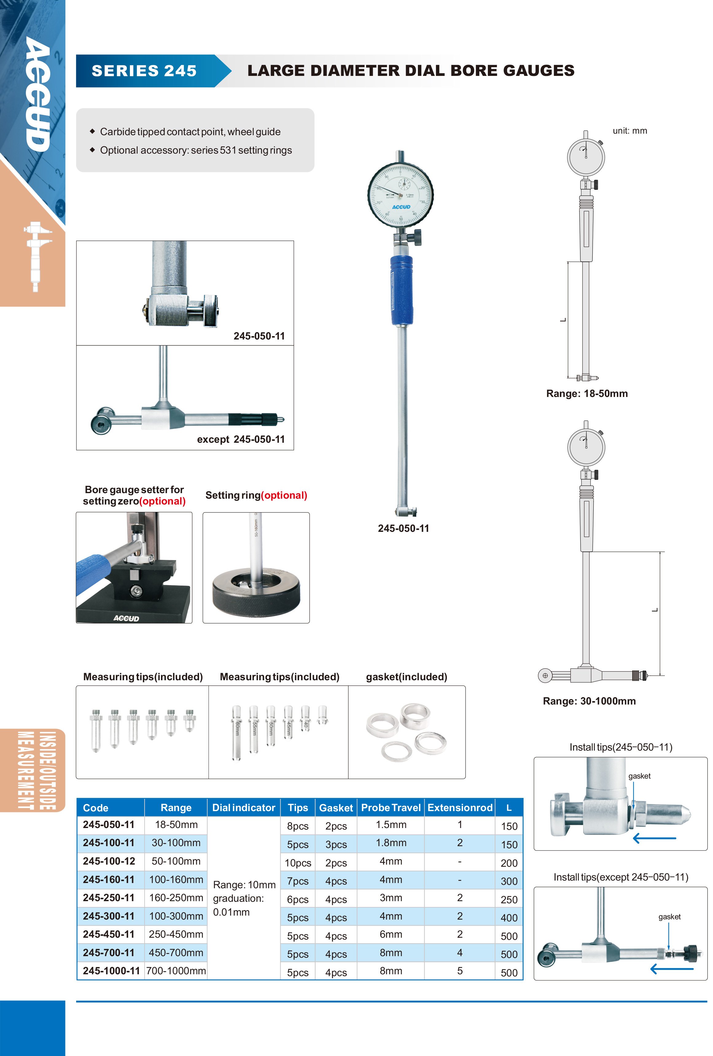 ACCUD 245-250-11 dutinoměr s číselníkovým úchylkoměrem / 160-250mm / 0.01mm