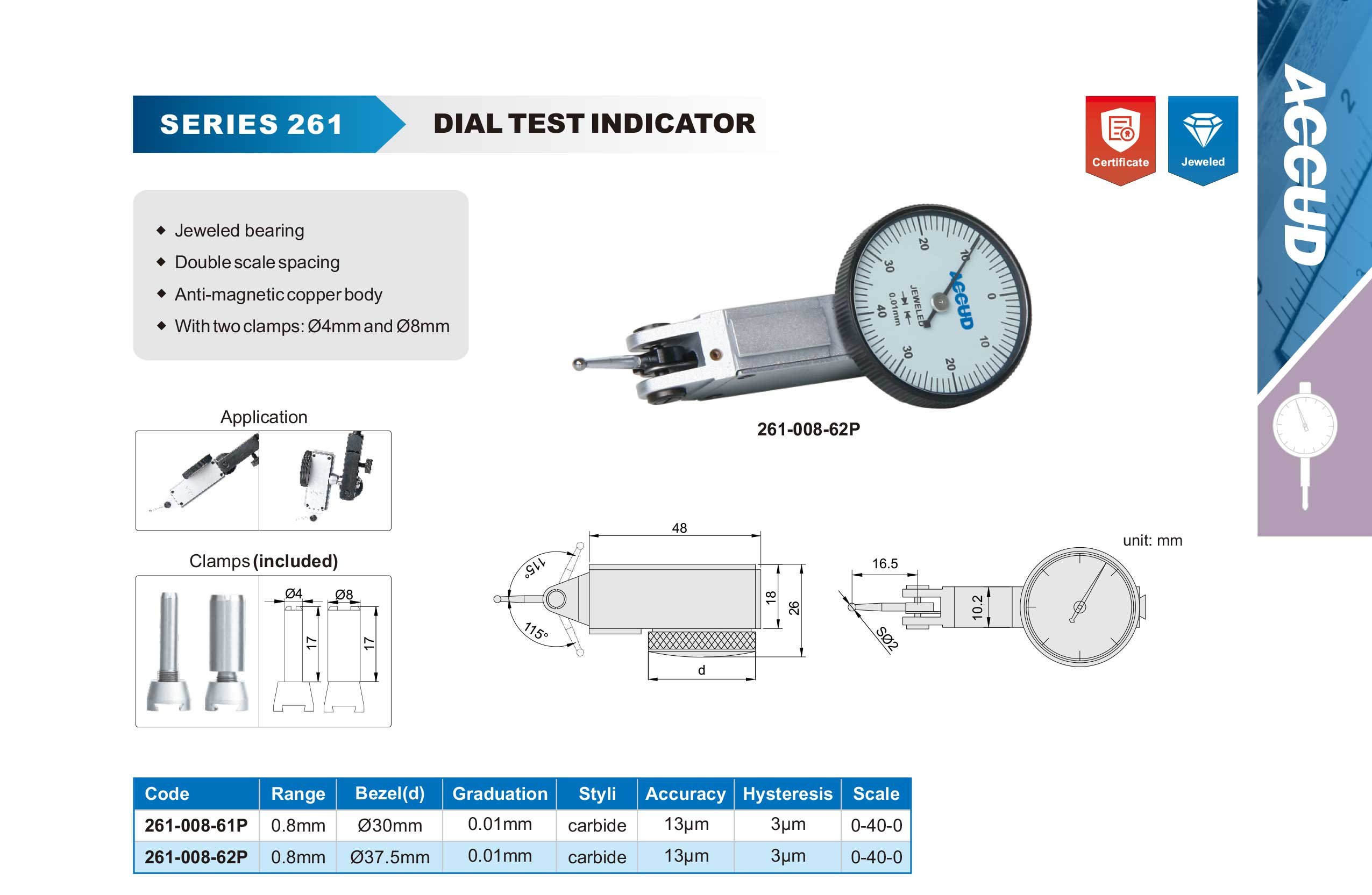 ACCUD 261-008-61P páčkový číselníkový úchylkoměr 0-0.8mm ( 0.01mm ) ciferník pr. 30mm