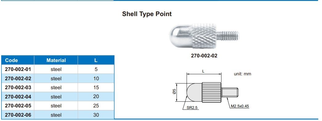 ACCUD 270-002-04 měřící dotek radiusový R2,5mm pro úchylkoměry, ocel / L20mm /