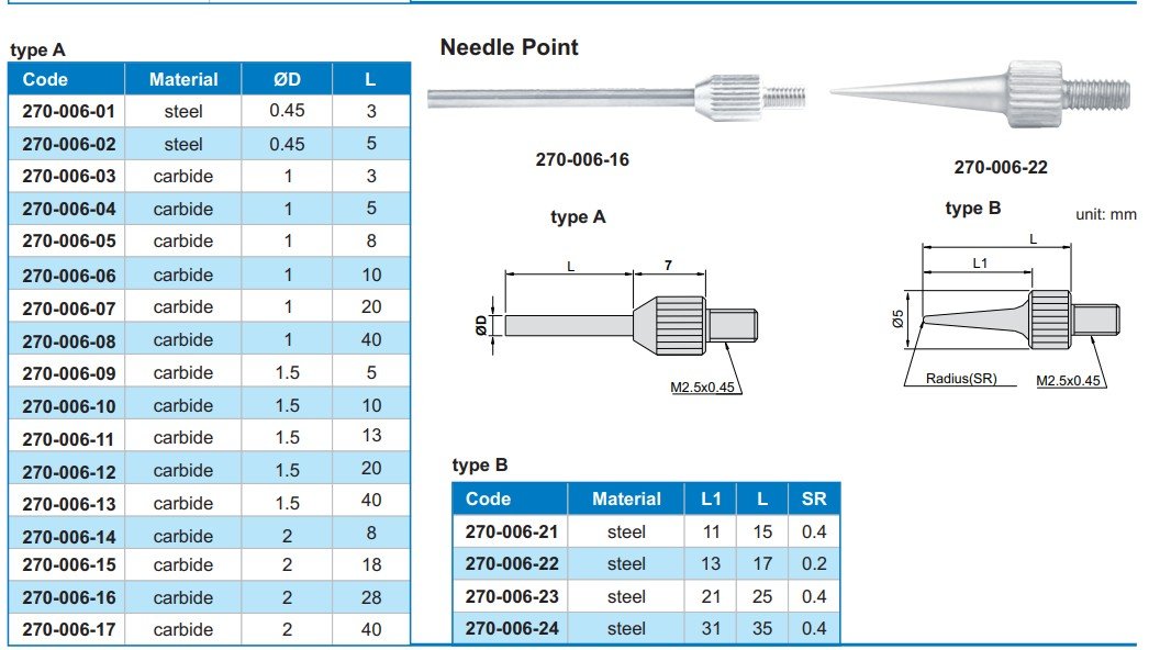ACCUD 270-006-02 měřící dotek pro úchylkoměry válcový, ocel / pr. 0.45mm x 5 /