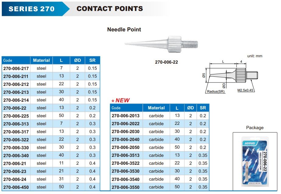 ACCUD 270-006-22 měřící dotek pro úchylkoměry rádiusový, ocel / 17mm /