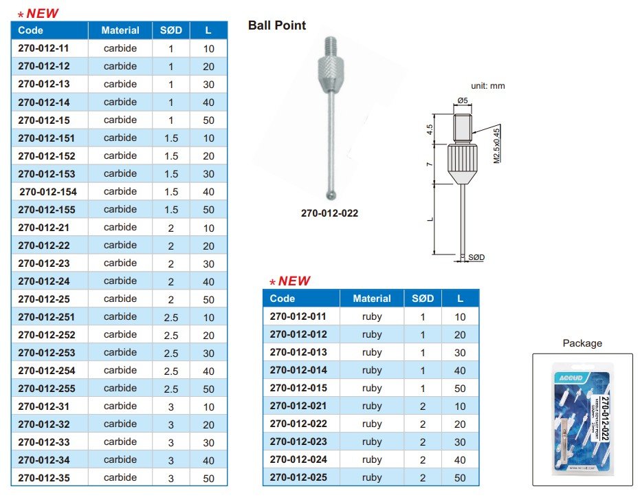 ACCUD 270-012-154 kuličkový dotek pro úchylkoměry, karbid / 1.5mm x 40 /