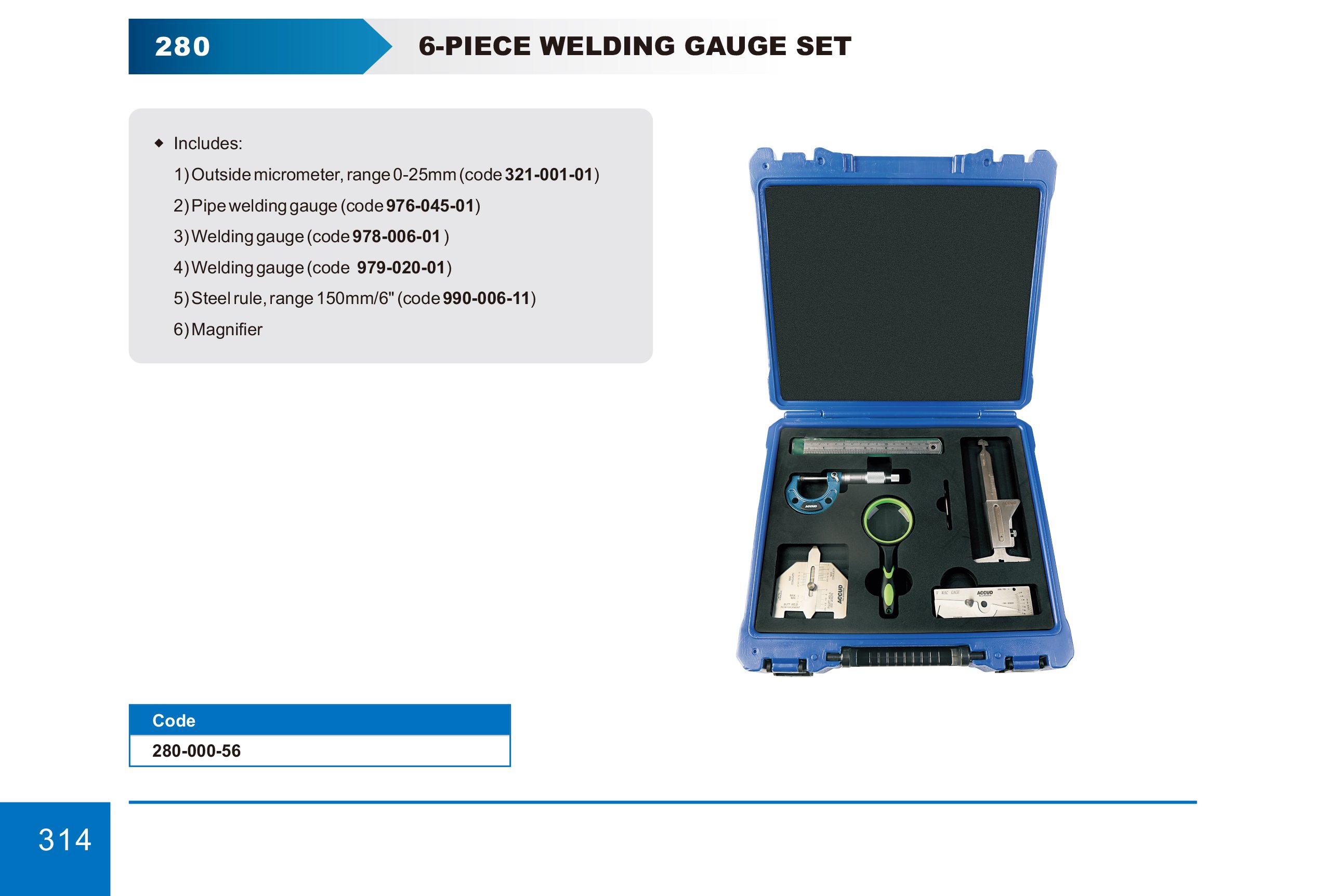 6 dílná sada měrek pro svářeče Obsahuje: 1) Vnější mikrometr, rozsah 0-25 mm (kód 321-001-01) 2) Svarová měrka pro potrubí (kód 976-045-01) 3) Univerzální měrka pro svářeče (kód 978-006-01 … Více
