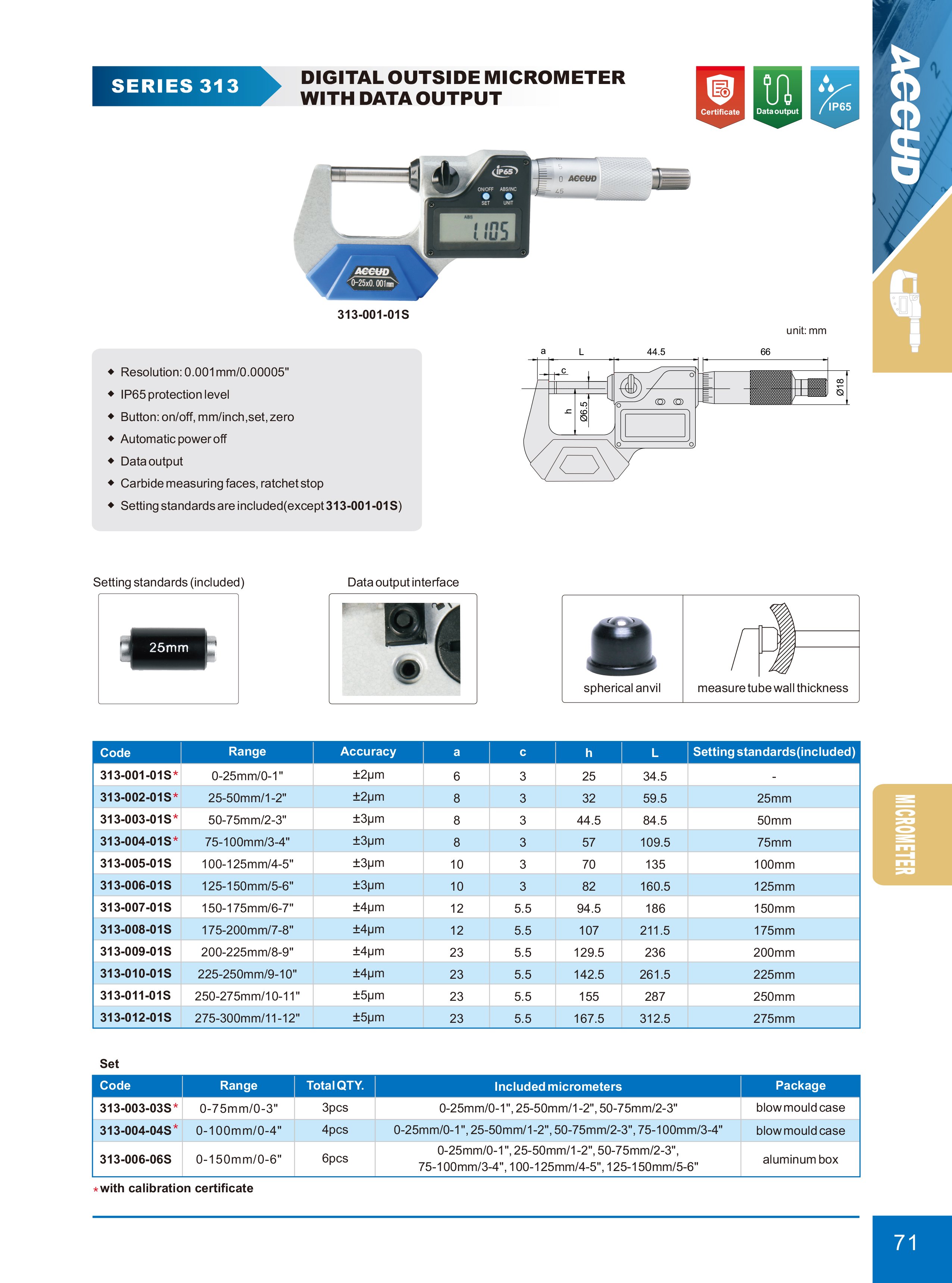 ACCUD 313-010-01S digitální mikrometr 225-250mm/9-10" IP65 s datovým výstupem (0.001mm/0.00005")