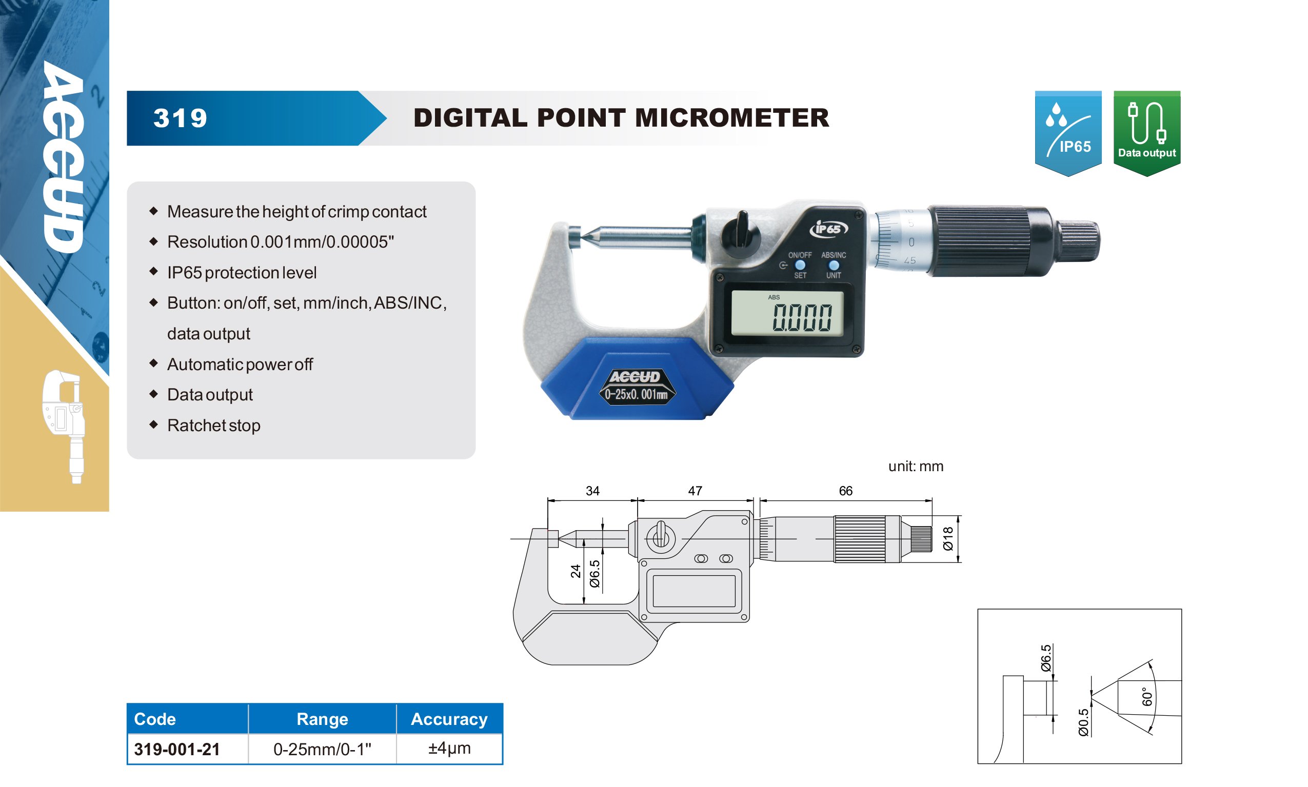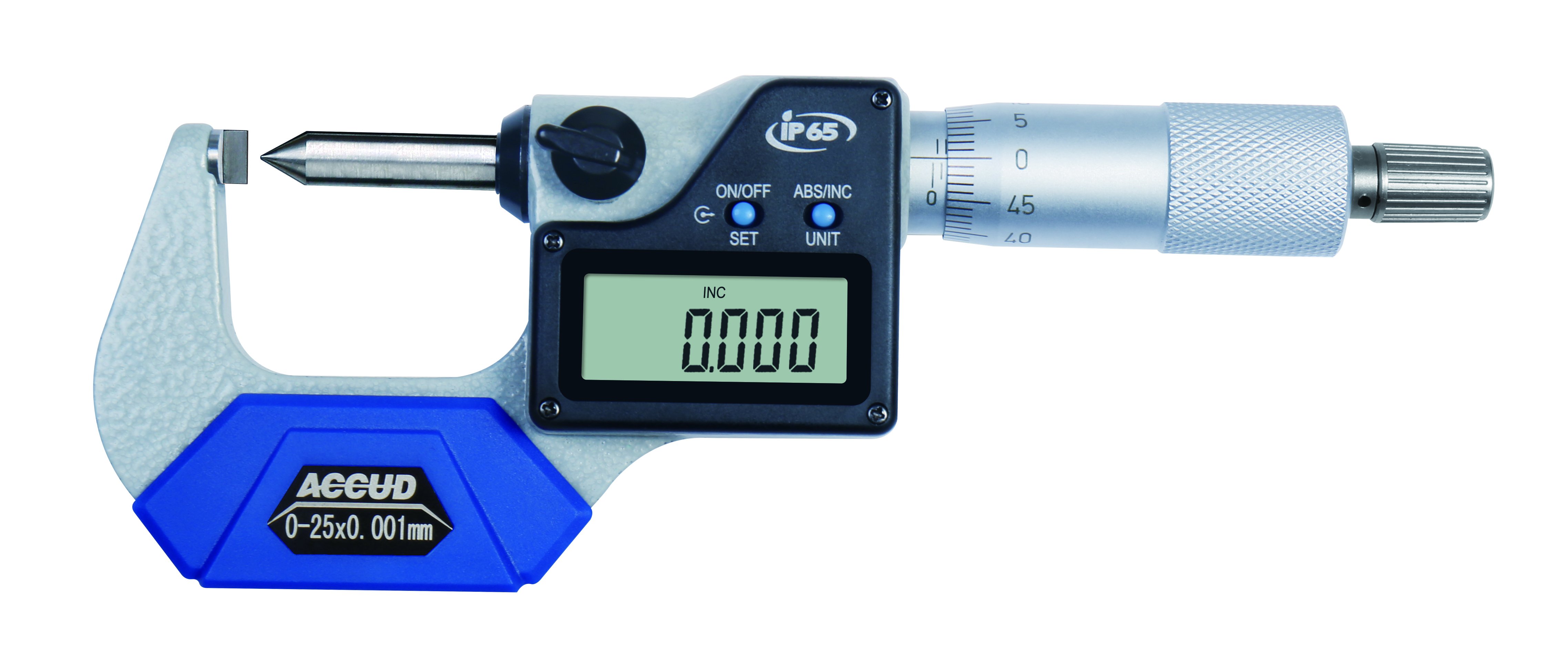 ACCUD 319-001-21 digitální PONIT mikrometr, 0-25mm/0-1 flat-se špičatými měřicími plochami tips (0.001mm/0.00005")