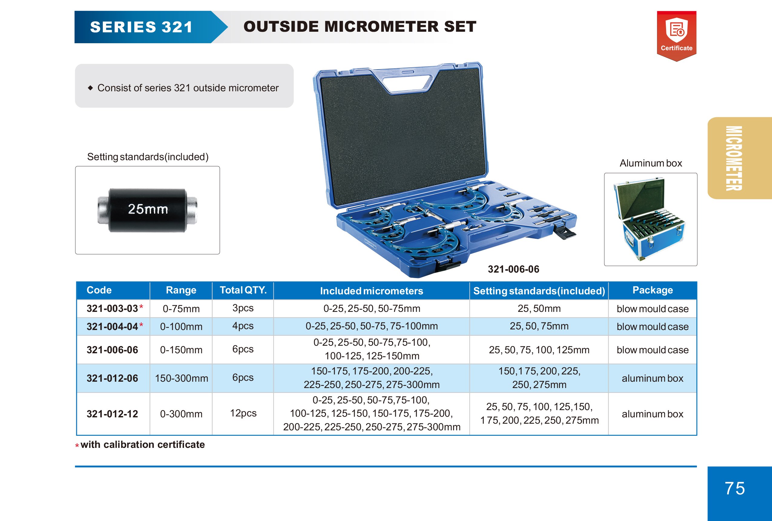Sada tří vnějších mikrometrů v boxu řady 321, včetně nastavovací měrky mikrometrů.