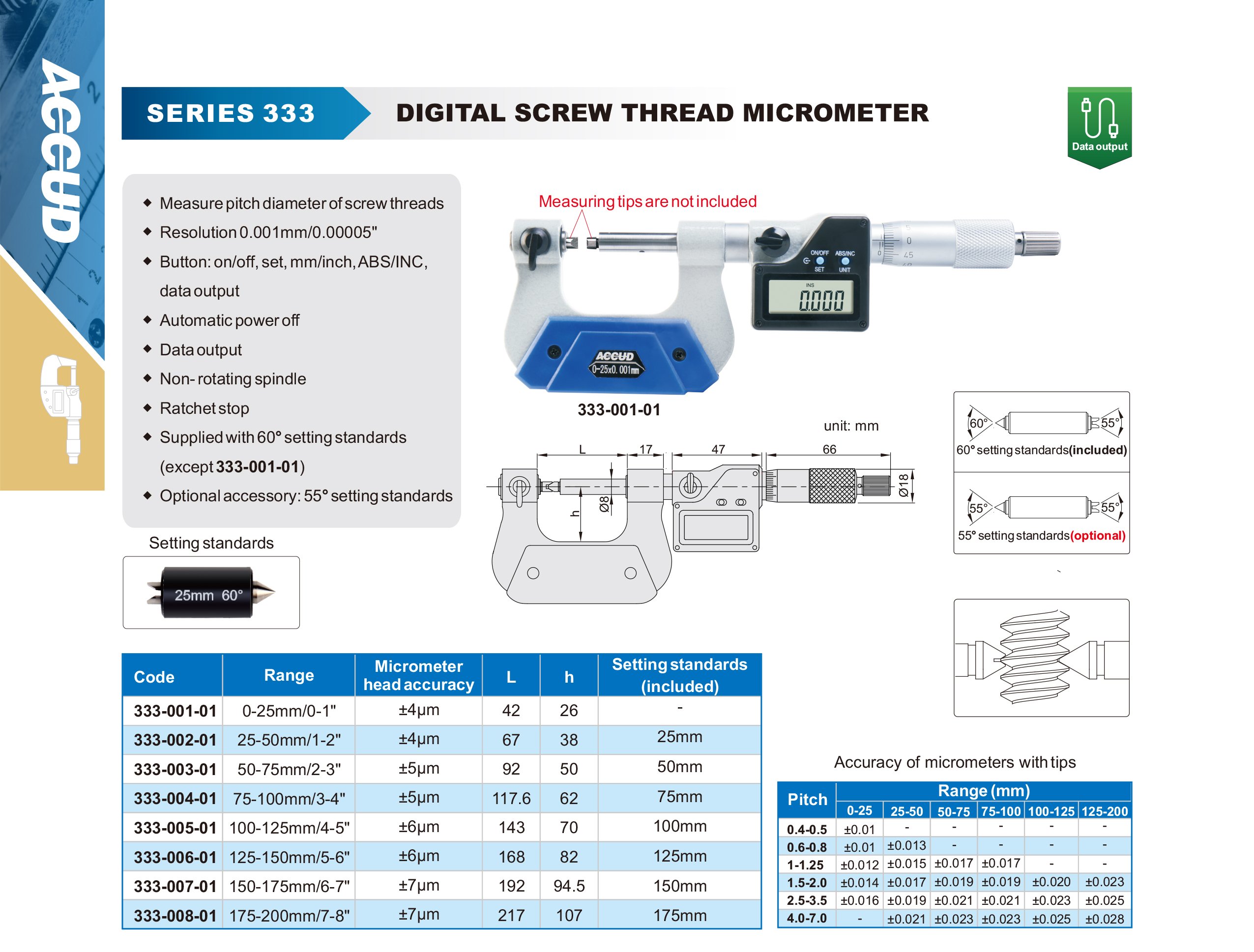 ACCUD 333-002-01 digitální třmenový mikrometr na měření šroubového závitu, 25-50mm/1-2" bez měřících doteků (0.001mm/0.00005")