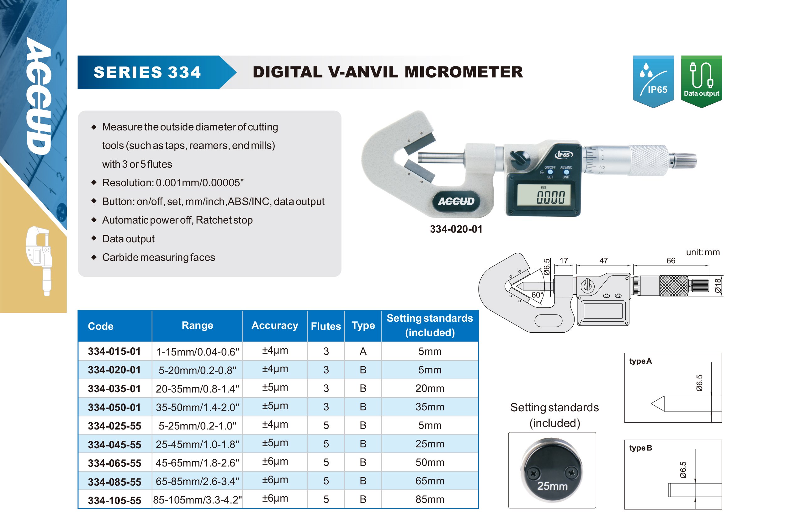 ACCUD 334-015-01 digitální třmenový mikrometr s prizmatickými měřicími plochami, 1-15mm/0.04-0.6”, 3 flutes 60° (0.001mm/0.00005")