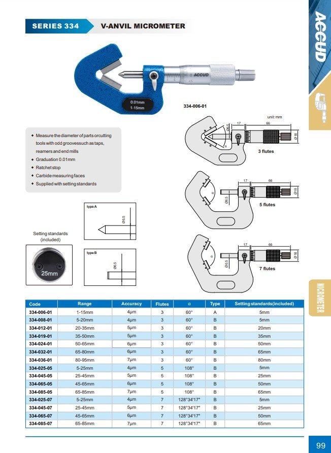 ACCUD 334-032-01 třmenový mikrometr 65-80mm s prizmatickými měřicími plochami 3 flute 60° (0.01mm)