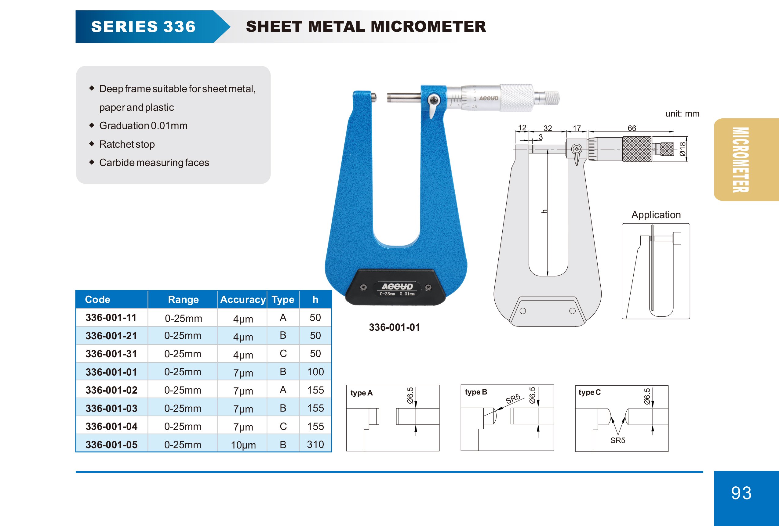 ACCUD 336-001-01 mikrometr 0-25mm / 100mm na měření plošných materiálů R/F (0.01mm)