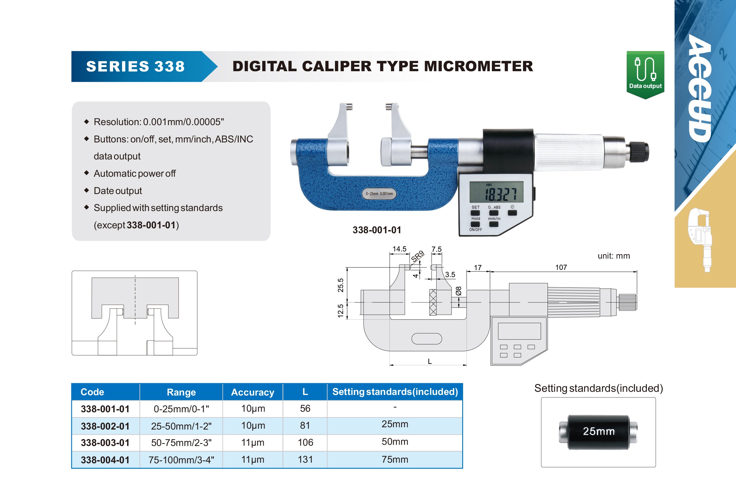 ACCUD 338-001-01 speciální digitální mikrometr s měřicími čelistmi 0-25mm/0-1" (0.001mm/0.00005")