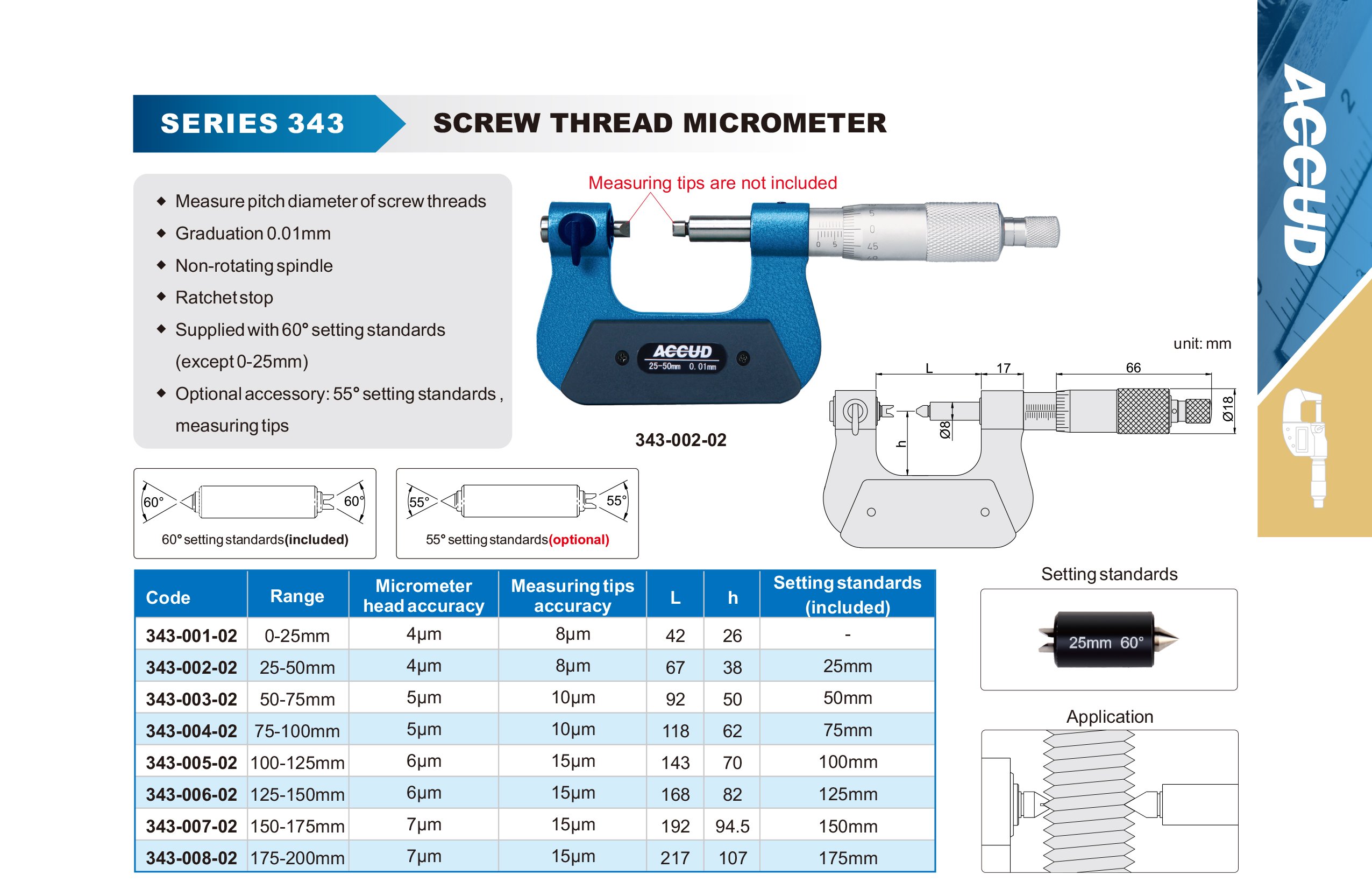 ACCUD 343-001-02 ACCCUD třmenový mikrometr 0-25mm na měření šroubového závitu, bez měřicích doteků pro metrické závity (0.01mm)