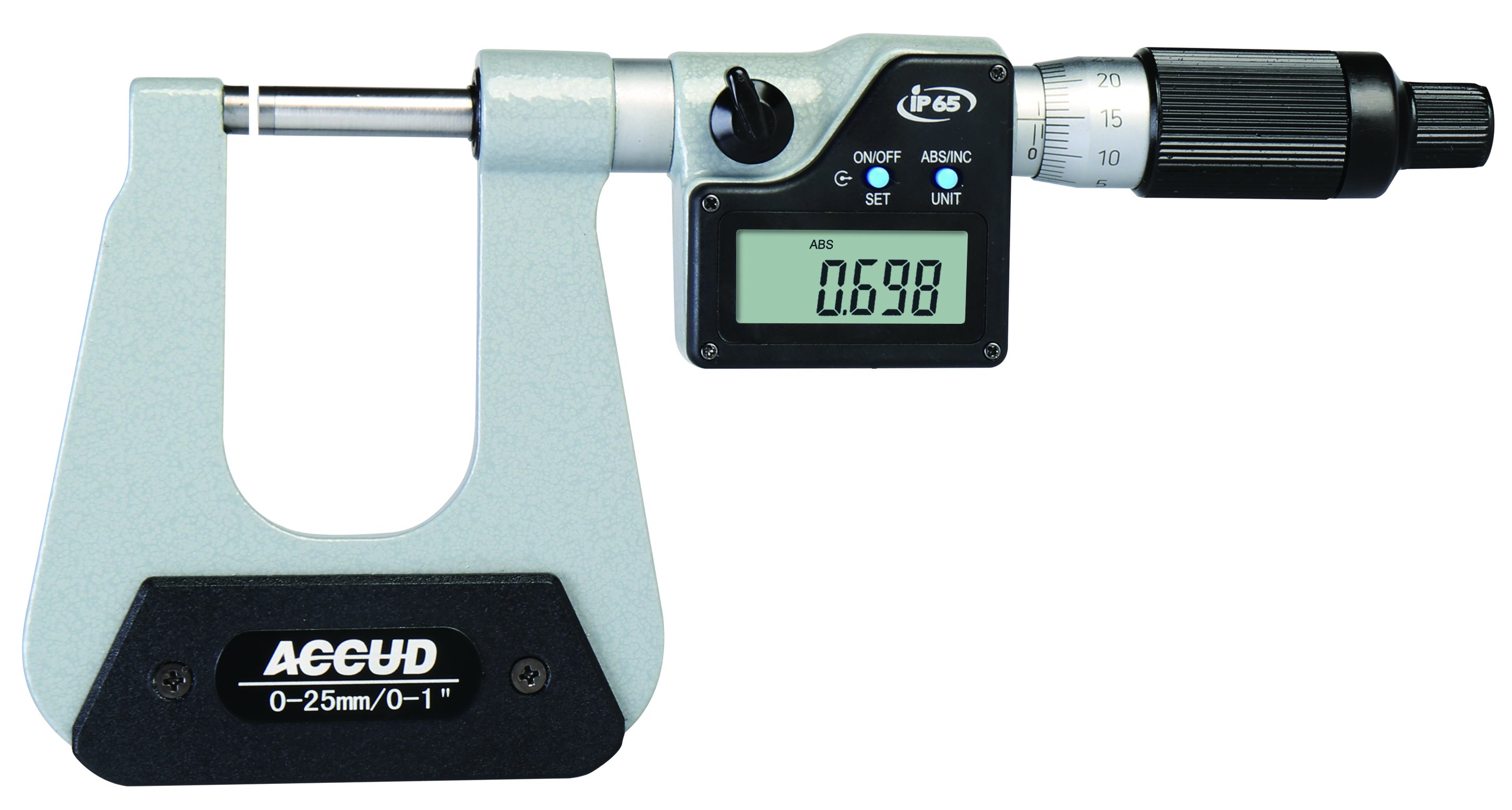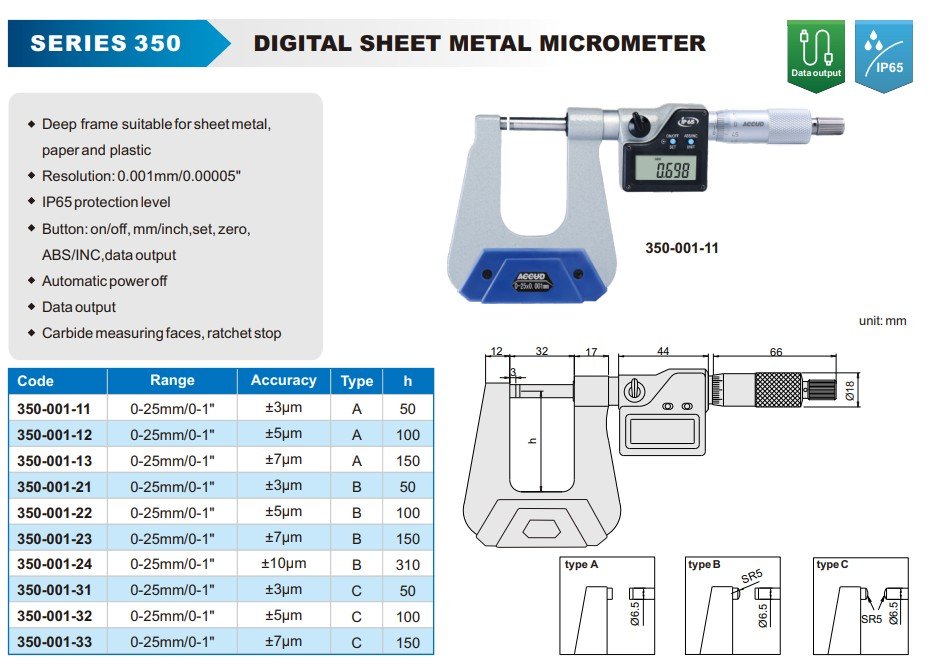 ACCUD 350-001-22 digitální mikrometr na plech 0-25mm/0-1" h100mm IP65 (0.001mm/0.00005)