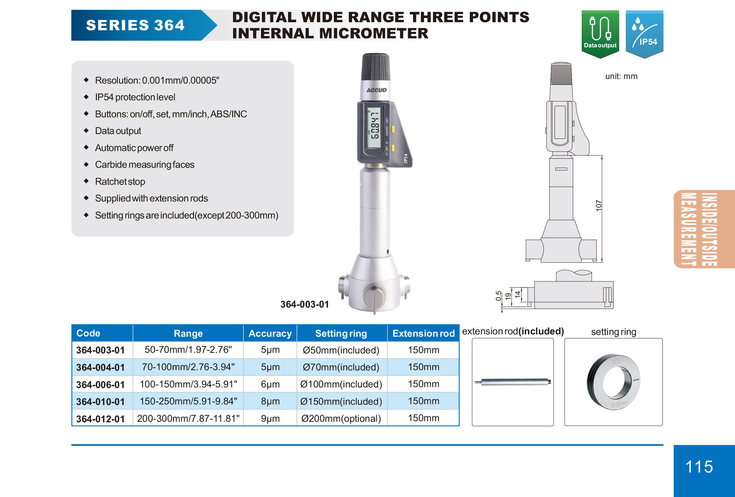 ACCUD 364-012-01 digitální třídotekový dutinoměr s širším rozsahem 200-300mm/7.87-11.81" ( 0.001mm/0.00005" )
