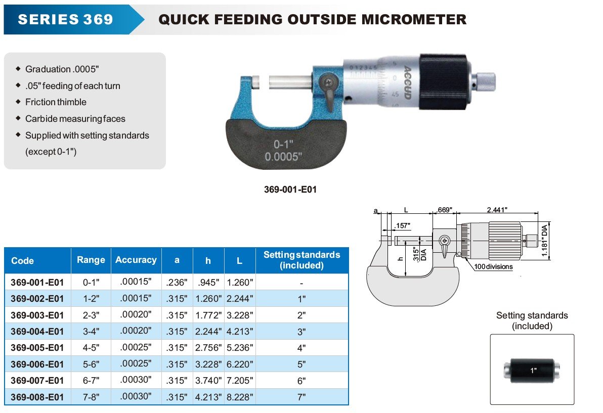 Vnější mikrometr s rychloposuvem nabízí posuv 0,05" na jednu otáčku, je vybaven třecím rámečkem pro plynulé a přesné měření a má karbidové měřicí plochy pro dlouhou životnost. Součástí balení jsou etalony (s výjimkou rozsahu 0–1").